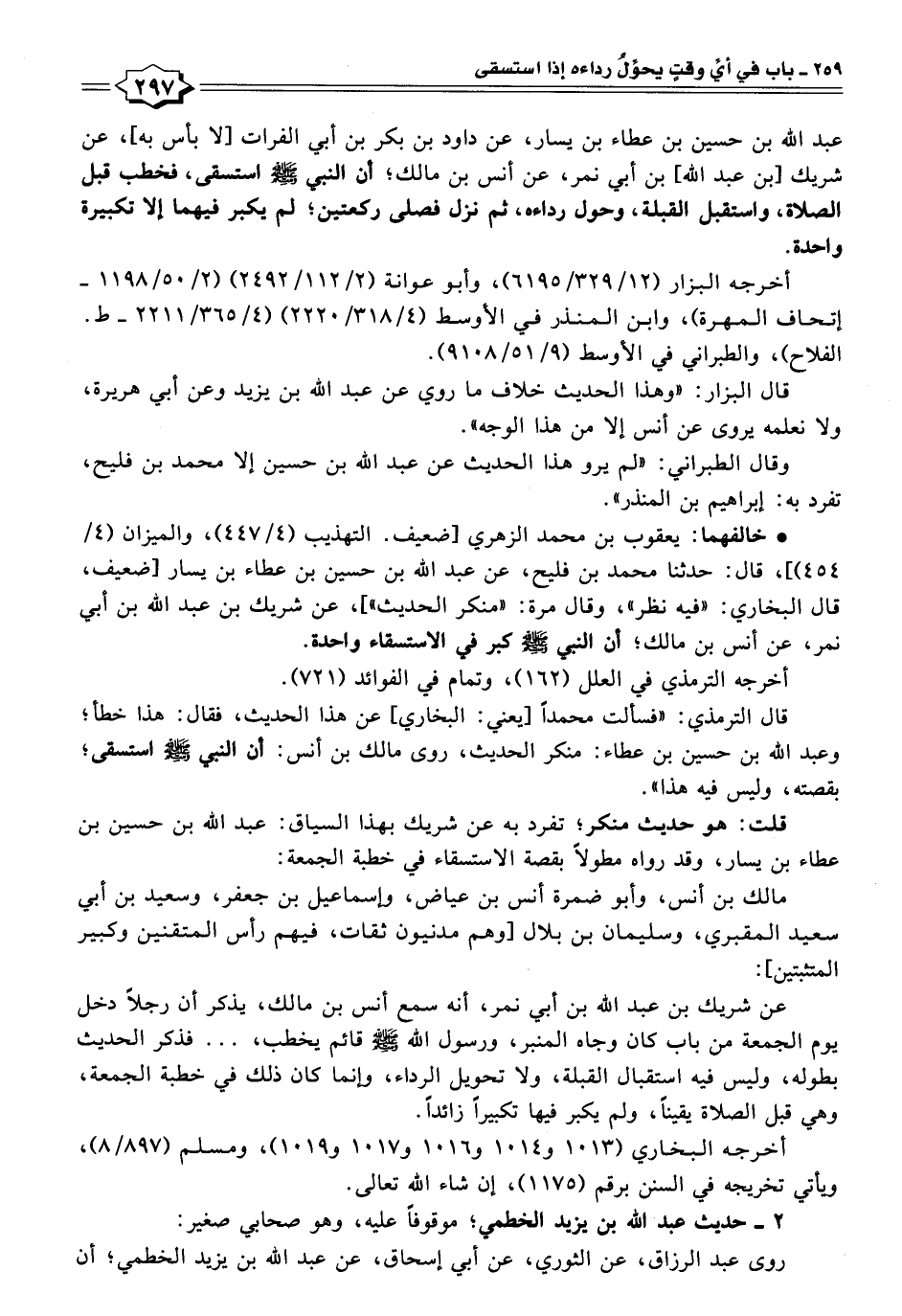 • خالفهما: يعقوب بن محمد الزهري [ضعيف. التهذيب (٤/ ٤٤٧)، والميزان (٤/ ٤٥٤)]، قال: حدثنا محمد بن فليح، عن عبد اللَّه بن حسين بن عطاء بن يسار [ضعيف، قال البخاري: "فيه نظر"، وقال مرة: "منكر الحديث"]، عن شريك بن عبد اللَّه بن أبي نمر، عن أنس بن مالك؛ أن النبي -صلى اللَّه عليه وسلم- كبر في الاستسقاء واحدة.