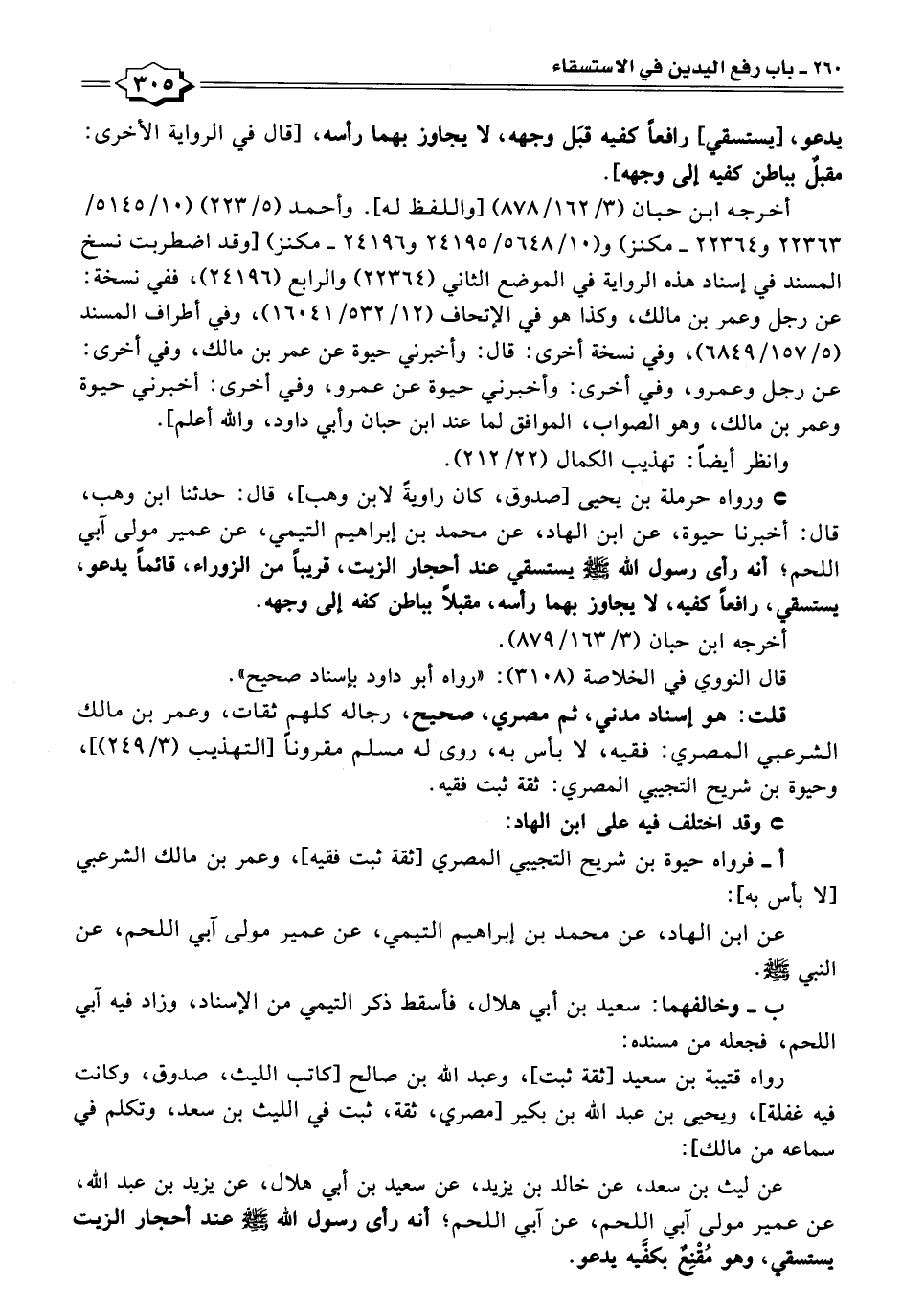 * ورواه حرملة بن يحيى [صدوق، كان راويةً لابن وهب]، قال: حدثنا ابن وهب، قال: أخبرنا حيوة، عن ابن الهاد، عن محمد بن إبراهيم التيمي، عن عمير مولى آبي اللحم؛ أنه رأى رسول اللَّه -صلى اللَّه عليه وسلم- يستسقي عند أحجار الزيت، قريبًا من الزوراء، قائمًا يدعو، يستسقي، رافعًا كفيه، لا يجاوز بهما رأسه، مقبلًا بباطن كفه إلى وجهه.