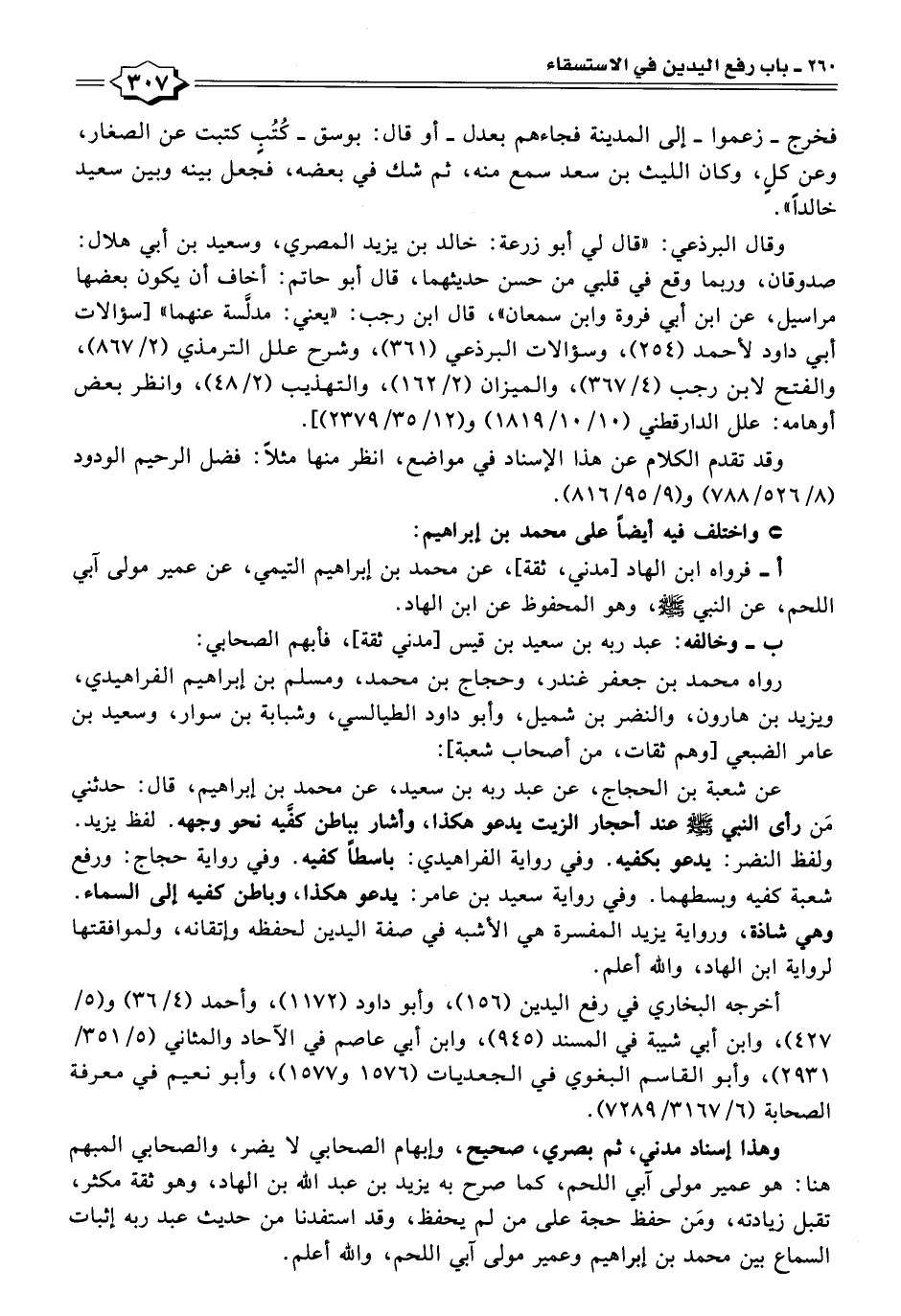 عن شعبة بن الحجاج، عن عبد ربه بن سعيد، عن محمد بن إبراهيم، قال: حدثني مَن رأى النبي -صلى اللَّه عليه وسلم- عند أحجار الزيت يدعو هكذا، وأشار بباطن كفيه نحو وجهه. لفظ يزيد. ولفظ النضر: يدعو بكفيه. وفي رواية الفراهيدي: باسطًا كفيه. وفي رواية حجاج: ورفع شعبة كفيه وبسطهما. وفي رواية سعيد بن عامر: يدعو هكذا، وباطن كفيه إلى السماء. وهي شاذة، ورواية يزيد المفسرة هي الأشبه في صفة اليدين لحفظه وإتقانه، ولموافقتها لرواية ابن الهاد، واللَّه أعلم.