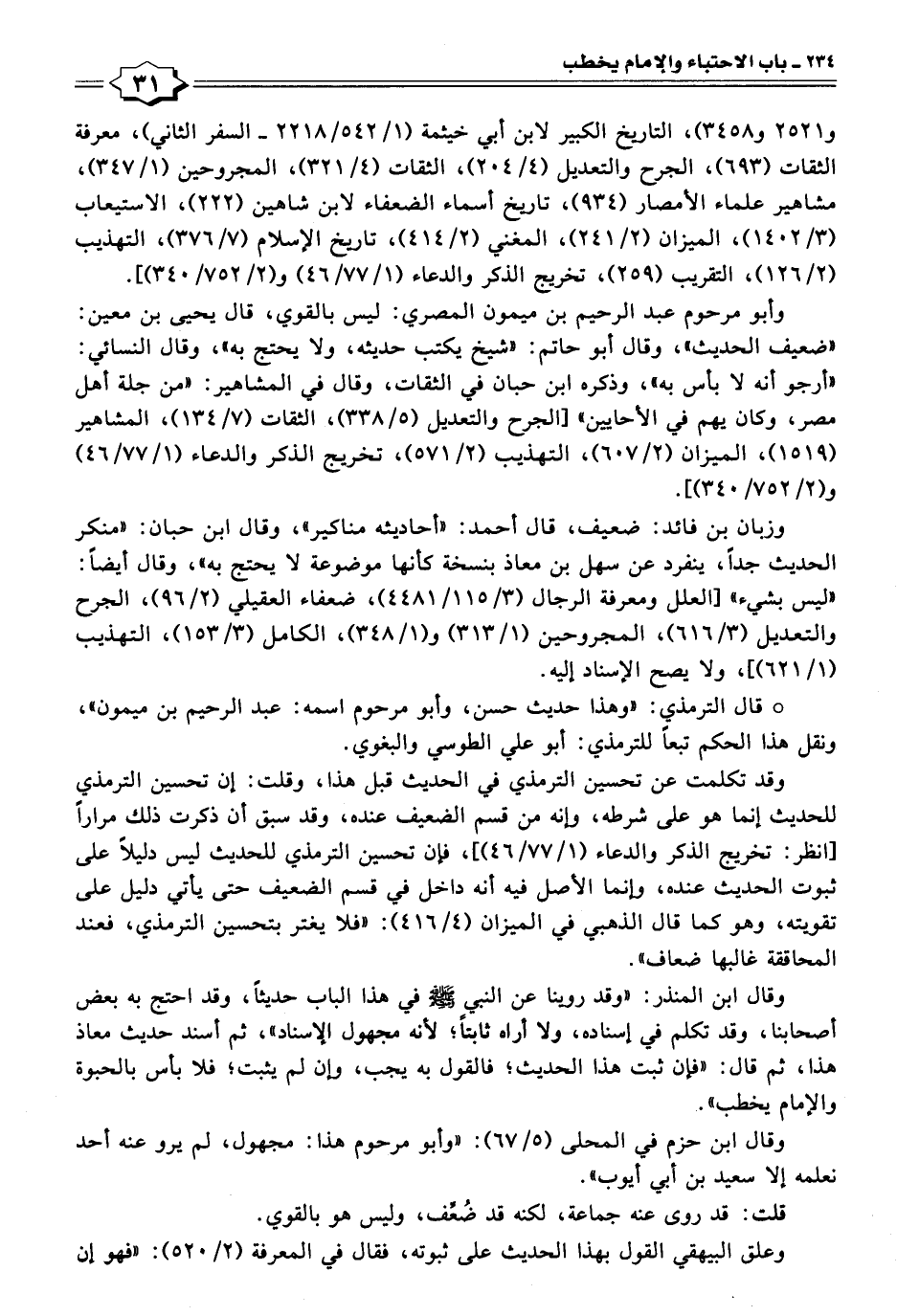 وقال ابن المنذر: "وقد روينا عن النبي - صلى الله عليه وسلم - في هذا الباب حديثًا، وقد احتج به بعض أصحابنا، وقد تكلم في إسناده، ولا أراه ثابتًا؛ لأنه مجهول الإسناد"، ثم أسند حديث معاذ هذا، ثم قال: "فإن ثبت هذا الحديث؛ فالقول به يجب، وإن لم يثبت؛ فلا بأس بالحبوة والإمام يخطب".