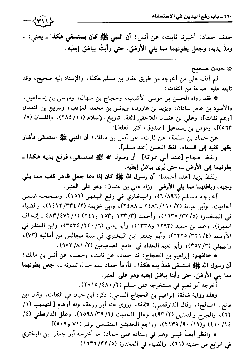 • خالفهم: إبراهيم بن الحجاج: ثنا حماد، عن ثابت، وحميد، عن أنس بن مالك؛ أن رسول اللَّه -صلى اللَّه عليه وسلم- استسقى فمدَّ يده هكذا -فأومأ حماد بيده حيال ثندوته-، جعل بطونهما مما يلي الأرضَ، حتى رأينا بياضَ إبطيه وهو على المنبر.