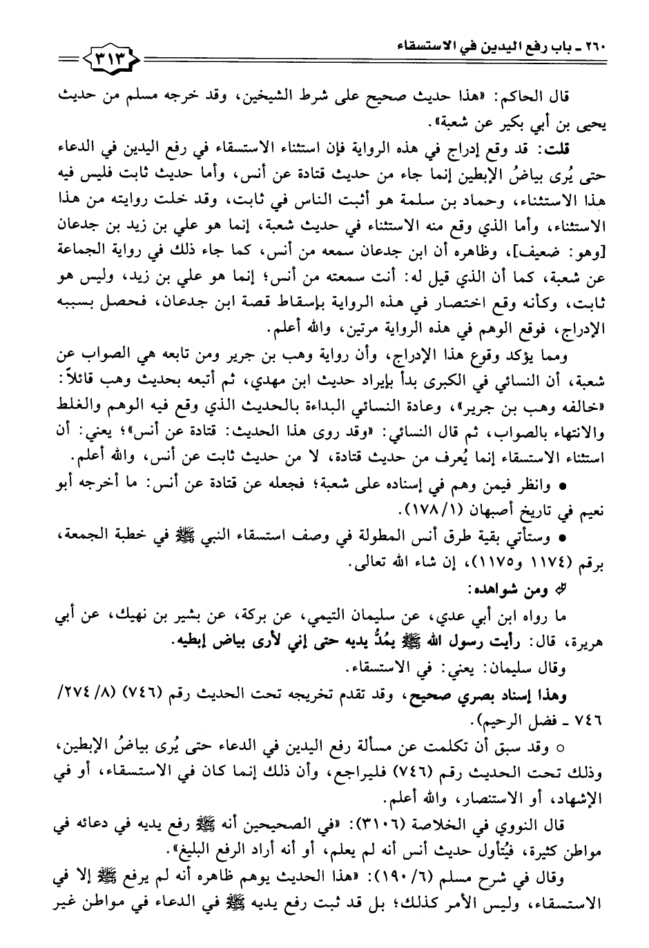ومما يؤكد وقوع هذا الإدراج، وأن رواية وهب بن جرير ومن تابعه هي الصواب عن شعبة، أن النسائي في الكبرى بدأ بإيراد حديث ابن مهدي، ثم أتبعه بحديث وهب قائلًا: "خالفه وهب بن جرير"، وعادة النسائي البداءة بالحديث الذي وقع فيه الوهم والغلط والانتهاء بالصواب، ثم قال النسائي: قد روى هذا الحديث: قتادة عن أنس"؛ يعني: أن اسشاء الاستسقاء إنما يُعرف من حديث قتادة، لا من حديث ثابت عن أنس، واللَّه أعلم.