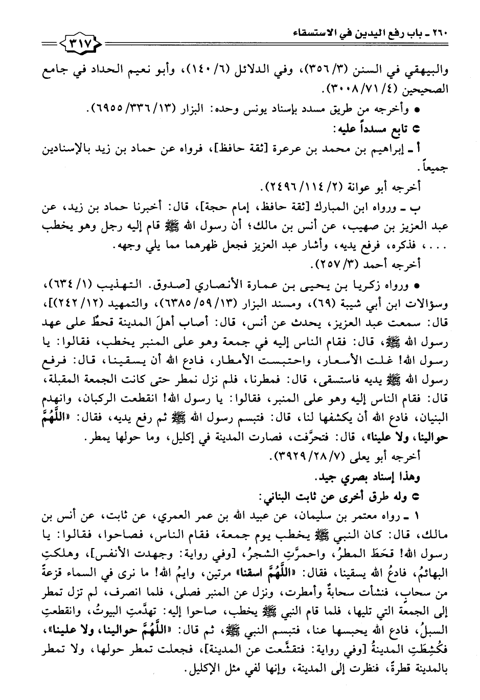• ورواه زكريا بن يحيى بن عمارة الأنصاري [صدوق. التهذيب (١/ ٦٣٤)، وسؤالات ابن أبي شيبة (٦٩)، ومسند البزار (١٣/ ٥٩/ ٦٣٨٥)، والتمهيد (١٢/ ٢٤٢)]، قال: سمعت عبد العزيز، يحدث عن أنس، قال: أصاب أهلَ المدينة قحطٌ على عهد رسول اللَّه -صلى اللَّه عليه وسلم-، قال: فقام الناس إليه في جمعة وهو على المنبر يخطب، فقالوا: يا رسول اللَّه! غلت الأسعار، واحتبست الأمطار، فادع اللَّه أن يسقينا، قال: فرفع رسول اللَّه -صلى اللَّه عليه وسلم- يديه فاستسقى، قال: فمطرنا، فلم نزل نمطر حتى كانت الجمعة المقبلة، قال: فقام الناس إليه وهو على المنبر، فقالوا: يا رسول اللَّه! انقطعت الركبان، وانهدم البنيان، فادع اللَّه أن يكشفها لنا، قال: فتبسم رسول اللّه -صلى اللَّه عليه وسلم- ثم رفع يديه، فقال: "اللَّهُمَّ حوالينا، ولا علينا"، قال: فتحرَّفت، فصارت المدينة في إكليل، وما حولها يمطر.