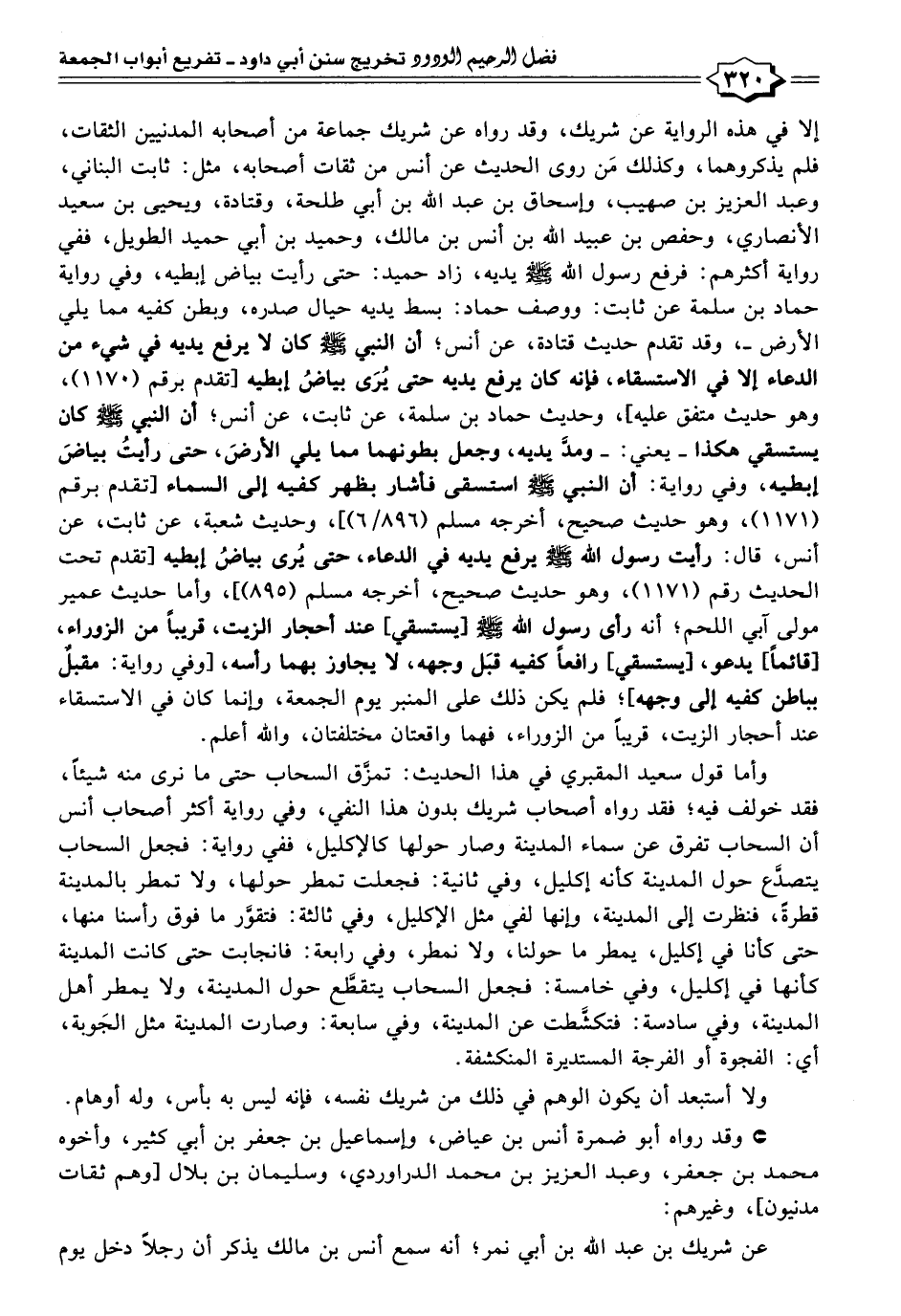 إِلَّا في هذه الرواية عن شريك، وقد رواه عن شريك جماعة من أصحابه المدنيين الثقات، فلم يذكروهما، وكذلك مَن روى الحديث عن أنس من ثقات أصحابه، مثل: ثابت البناني، وعبد العزيز بن صهيب، وإسحاق بن عبد اللَّه بن أبي طلحة، وقتادة، ويحيى بن سعيد الأنصاري، وحفص بن عبيد اللَّه بن أنس بن مالك، وحميد بن أبي حميد الطويل، ففي رواية أكثرهم: فرفع رسول اللَّه -صلى اللَّه عليه وسلم- يديه، زاد حميد: حتى رأيت بياض إبطيه، وفي رواية حماد بن سلمة عن ثابت: ووصف حماد: بسط يديه حيال صدره، وبطن كفيه مما يلي الأرض-، وقد تقدم حديث قتادة، عن أنس؛ أن النبي -صلى اللَّه عليه وسلم- كان لا يرفع يديه في شيء من الدعاء إِلَّا في الاستسقاء، فإنه كان يرفع يديه حتى يُرَى بياضُ إبطيه [تقدم برقم (١١٧٠)، وهو حديث متفق عليه]، وحديث حماد بن سلمة، عن ثابت، عن أنس؛ أن النبي -صلى اللَّه عليه وسلم- كان يستسقي هكذا -يعني:- ومدَّ يديه، وجعل بطونهما مما يلي الأرضَ، حتى رأيتُ بياضَ إبطيه، وفي رواية: أن النبي -صلى اللَّه عليه وسلم- استسقى فأشار بظهر كفّيه إلى السماء [تقدم برقم (١١٧١)، وهو حديث صحيح، أخرجه مسلم (٨٩٦/ ٦)]، وحديث شعبة، عن ثابت، عن أنس، قال: رأيت رسول اللَّه ي يرفع يديه في الدعاء، حتى يُرى بياضُ إبطيه [تقدم تحت الحديث رقم (١١٧١)، وهو حديث صحيح، أخرجه مسلم (٨٩٥)]، وأما حديث عمير مولى آبي اللحم؛ أنه رأى رسول اللَّه -صلى اللَّه عليه وسلم-[يستسقي] عند أحجار الزيت، قريبًا من الزوراء، [قائمًا] يدعو، [يستسقي] رافعًا كفيه قبَل وجهه، لا يجاوز بهما رأسه، [وفي رواية: مقبل بباطن كفيه إلى وجهه]؛ فلم يكن ذلك على المنبر يوم الجمعة، وإنما كان في الاستسقاء عند أحجار الزيت، قريبًا من الزوراء، فهما واقعتان مختلفتان، واللَّه أعلم.