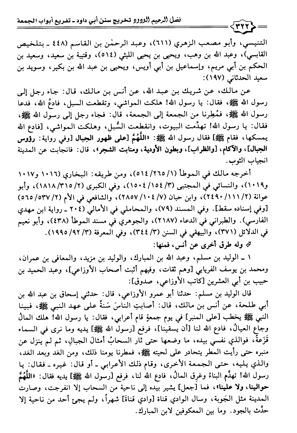 عن مالك، عن شريك بن عبد اللَّه، عن أنس بن مالك، قال: جاء رجل إلى رسول اللَّه -صلى اللَّه عليه وسلم-، فقال: يا رسول اللَّه! هلكت المواشي، وتقطعت السبل، فادع اللَّه، فدعا رسول اللَّه -صلى اللَّه عليه وسلم-، فمُطِرنا من الجمعة إلى الجمعة، قال: فجاء رجل إلى رسول اللَّه -صلى اللَّه عليه وسلم-، فقال: يا رسول اللَّه! تهدَّمت البيوت، وانقطعت السُّبل، وهلكت المواشي، [فادع اللَّه يمسكها، فقام -صلى اللَّه عليه وسلم-]، فقال رسول اللَّه -صلى اللَّه عليه وسلم-: "اللَّهُمَّ [على ظهور الجبال [وفي رواية: رؤوس الجبال]، والآكام، [والظراب]، وبطون الأودية، ومنابت الشجر"، قال: فانجابت عن المدينة انجياب الثوب.