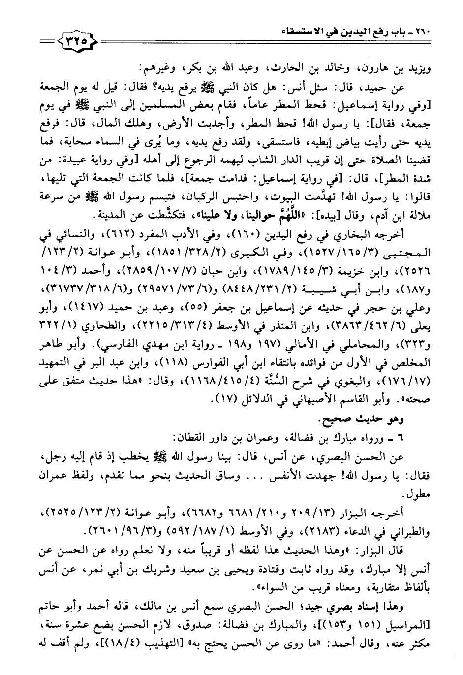 عن حميد، قال: سئل أنس: هل كان النبي -صلى اللَّه عليه وسلم- يرفع يديه؟ فقال: قيل له يوم الجمعة [وفي رواية إسماعيل: قحط المطر عامًا، فقام بعض المسلمين إلى النبي -صلى اللَّه عليه وسلم- في يوم جمعة، فقال]: يا رسول اللَّه! قحط المطر، وأجدبت الأرض، وهلك المال، قال: فرفع يديه حتى رأيت بياض إبطيه، فاستسقى، ولقد رفع يديه، وما يُرى في السماء سحابة، فما قضينا الصلاة حتى إن قريب الدار الشاب ليهمه الرجوع إلى أهله [وفي رواية عبيدة: من شدة المطر]، قال: [في رواية إسماعيل: فدامت جمعة]، فلما كانت الجمعة التي تليها، قالوا: يا رسول اللَّه! تهدَّمت البيوت، واحتبس الركبان، فتبسم رسول اللَّه -صلى اللَّه عليه وسلم- من سرعة ملالة ابن آدم، وقال [بيده]: "اللَّهُمَّ حوالينا، ولا علينا"، فتكشَّطت عن المدينة.