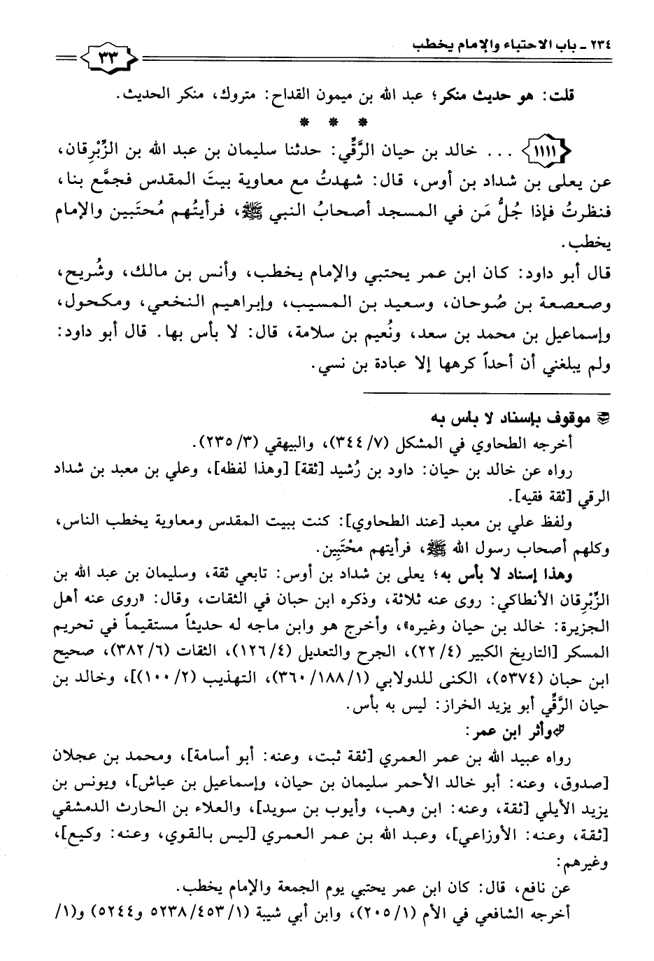 ١١١١ - . . . خالد بن حيان الرَّقِّي: حدثنا سليمان بن عبد الله بن الزِّبْرِقان، عن يعلى بن شداد بن أوس، قال: شهدتُ مع معاوية بيتَ المقدس فجمَّع بنا، فنظرتُ فإذا جُلُّ مَن في المسجد أصحابُ النبي - صلى الله عليه وسلم -، فرأيتُهم مُحتَبين والإمام يخطب.