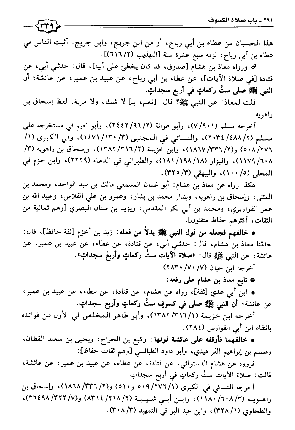 • خالفهم فجعله من قول النبي -صلى اللَّه عليه وسلم- بدلًا من فعله: زيد بن أخزم [ثقة حافظ]، قال: حدثنا معاذ بن هشام، قال: حدثني أبي، عن قتادة، عن عطاء، عن عبيد بن عمير، عن عائشة، عن النبي -صلى اللَّه عليه وسلم- قال: "صلاة الآيات ستُّ ركعاتٍ وأربعُ سجداتٍ".