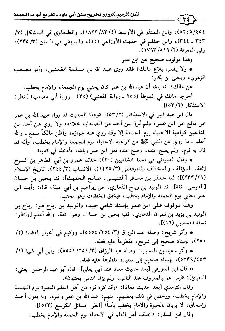 قال ابن عبد البر في الاستذكار (٢/ ٥٣): "وهذا الحديث قد رواه عبيد الله بن عمر عن نافع عن ابن عمر، ولم يُروَ عن أحد من الصحابة خلافه، ولا روي عن أحد من التابعين كراهية الاحتباء يوم الجمعة إلا وقد روي عنه جوازه، وأظن مالكًا سمع - والله أعلم - ما روي عن النبي - صلى الله عليه وسلم - من كراهية الاحتباء يوم الجمعة والإمام يخطب، وأنه قد قال به قوم، ولم يصح عنده، وصح عنده فعل ابن عمر وبلغه، فأدخله في كتابه".