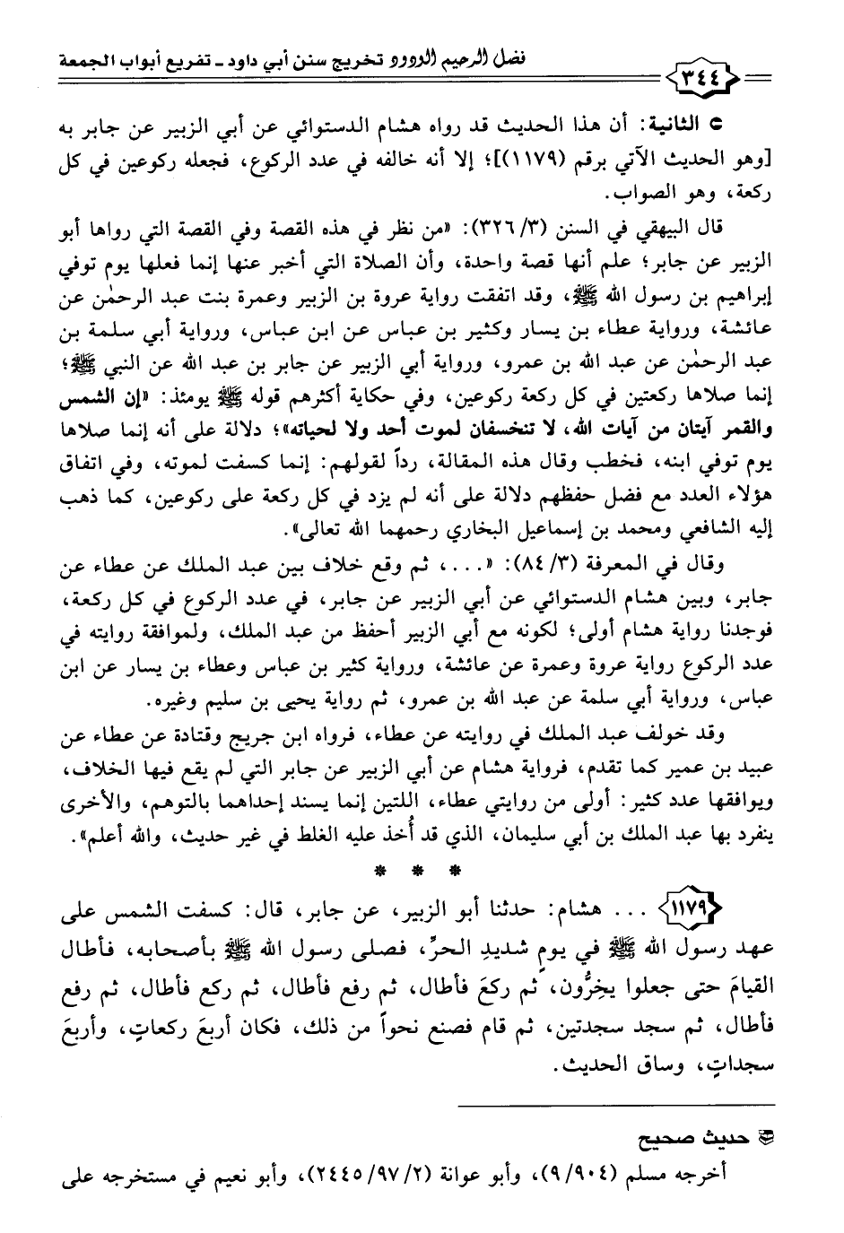 * الثانية: أن هذا الحديث قد رواه هشام الدستوائي عن أبي الزبير عن جابر به [وهو الحديث الآتي برقم (١١٧٩)]؛ إِلا أنه خالفه في عدد الركوع، فجعله ركوعين في كل ركعة، وهو الصواب.