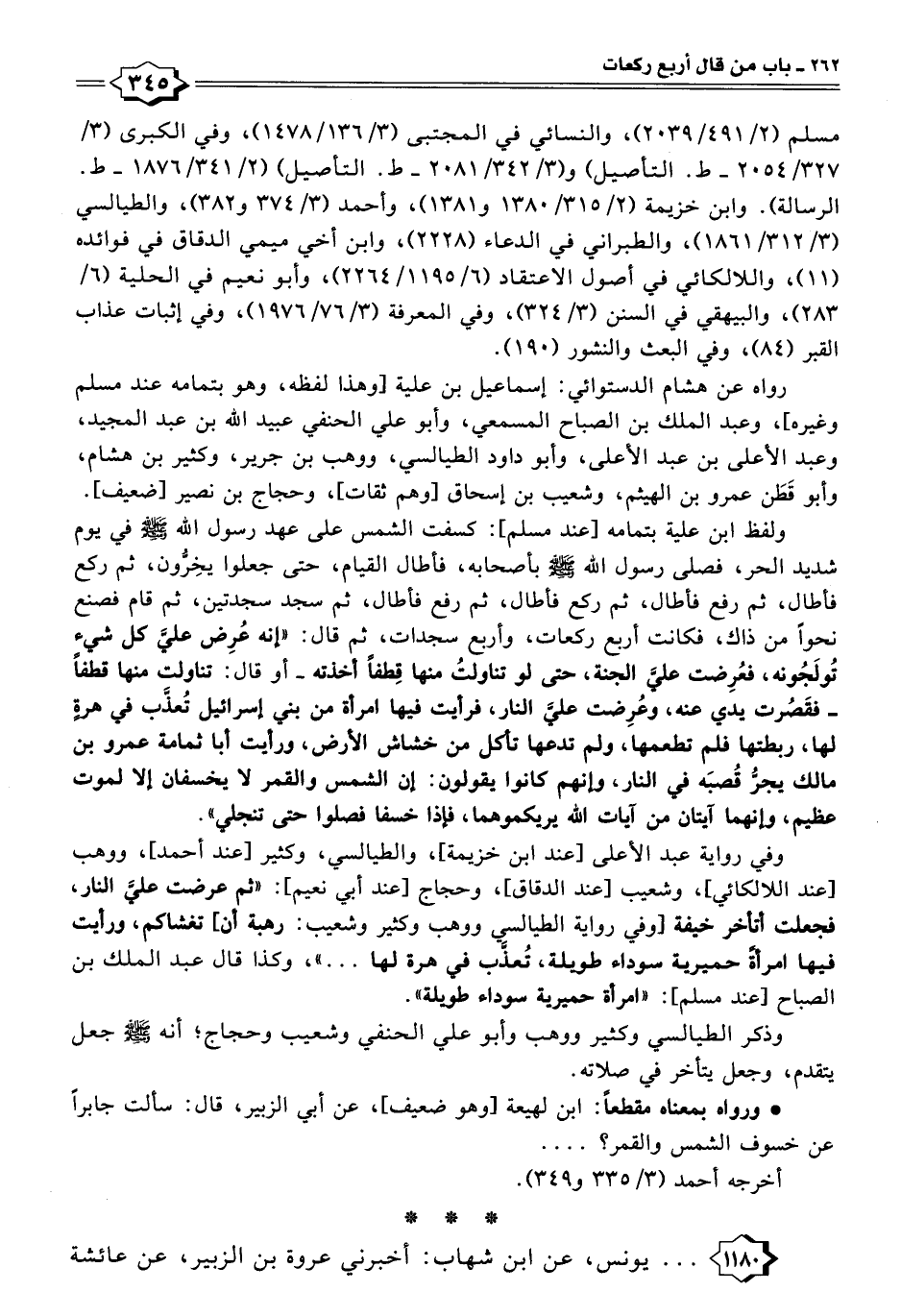 ولفظ ابن علية بتمامه [عند مسلم]: كسفت الشمس على عهد رسول اللَّه -صلى اللَّه عليه وسلم- في يوم شديد الحر، فصلى رسول اللَّه -صلى اللَّه عليه وسلم- بأصحابه، فأطال القيام، حتى جعلوا يخِرُّون، ثم ركع فأطال، ثم رفع فأطال، ثم ركع فأطال، ثم رفع فأطال، ثم سجد سجدتين، ثم قام فصنع نحوًا من ذاك، فكانت أربع ركعات، وأربع سجدات، ثم قال: "إنه عُرِض عليَّ كل شيءٍ تُولَجُونه، فعُرِضت عليَّ الجنة، حتى لو تناولتُ منها قِطفًا أخذته -أو قال: تناولت منها قطفًا- فقَصُرت يدي عنه، وعُرِضت عليَّ النار، فرأيت فيها امرأة من بني إسرائيل تُعذب في هرةٍ لها، ربطتها فلم تطعمها، ولم تدعها تأكل من خشاش الأرض، ورأيت أبا ثمامة عمرو بن مالك يجرُّ قُصبَه في النار، وإنهم كانوا يقولون: إن الشمس والقمر لا يخسفان إِلَّا لموت عظيم، وإنهما آيتان من آيات اللَّه يريكموهما، فإذا خسفا فصلوا حتى تنجلي".
