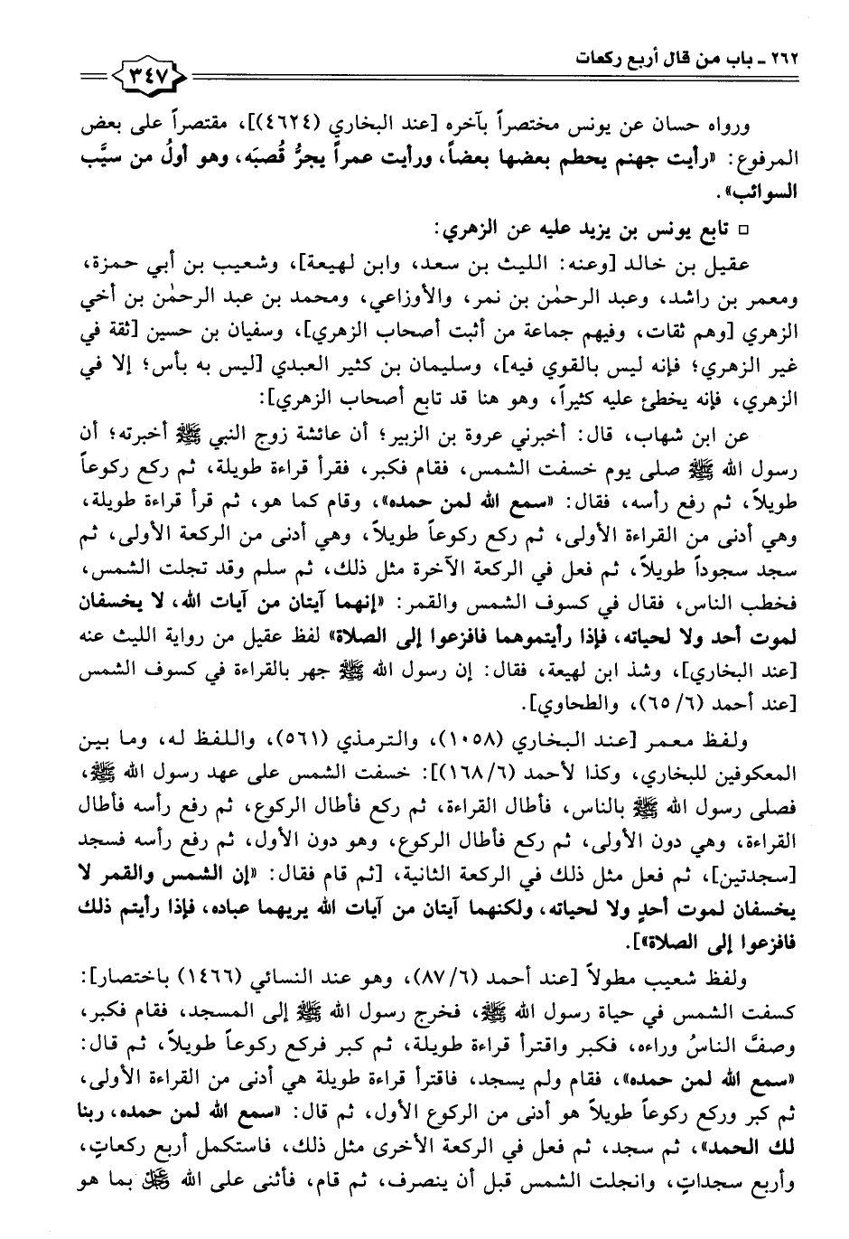 عن ابن شهاب، قال: أخبرني عروة بن الزبير؛ أن عائشة زوج النبي -صلى اللَّه عليه وسلم- أخبرته؛ أن رسول اللَّه -صلى اللَّه عليه وسلم- صلى يوم خسفت الشمس، فقام فكبر، فقرأ قراءة طويلة، ثم ركع ركوعًا طويلًا، ثم رفع رأسه، فقال: "سمع اللَّه لمن حمده"، وقام كما هو، ثم قرأ قراءة طويلة، وهي أدنى من القراءة الأولى، ثم ركع ركوعًا طويلًا، وهي أدنى من الركعة الأولى، ثم سجد سجودًا طويلًا، ثم فعل في الركعة الآخرة مثل ذلك، ثم سلم وقد تجلت الشمس، فخطب الناس، فقال في كسوف الشمس والقمر: "إنهما آيتان من آيات اللَّه، لا يخسفان لموت أحد ولا لحياته، فإذا رأيتموهما فافزعوا إلى الصلاة" لفظ عقيل من رواية الليث عنه [عند البخاري]، وشذ ابن لهيعة، فقال: إن رسول اللَّه -صلى اللَّه عليه وسلم- جهر بالقراءة في كسوف الشمس [عند أحمد (٦/ ٦٥)، والطحاوي].