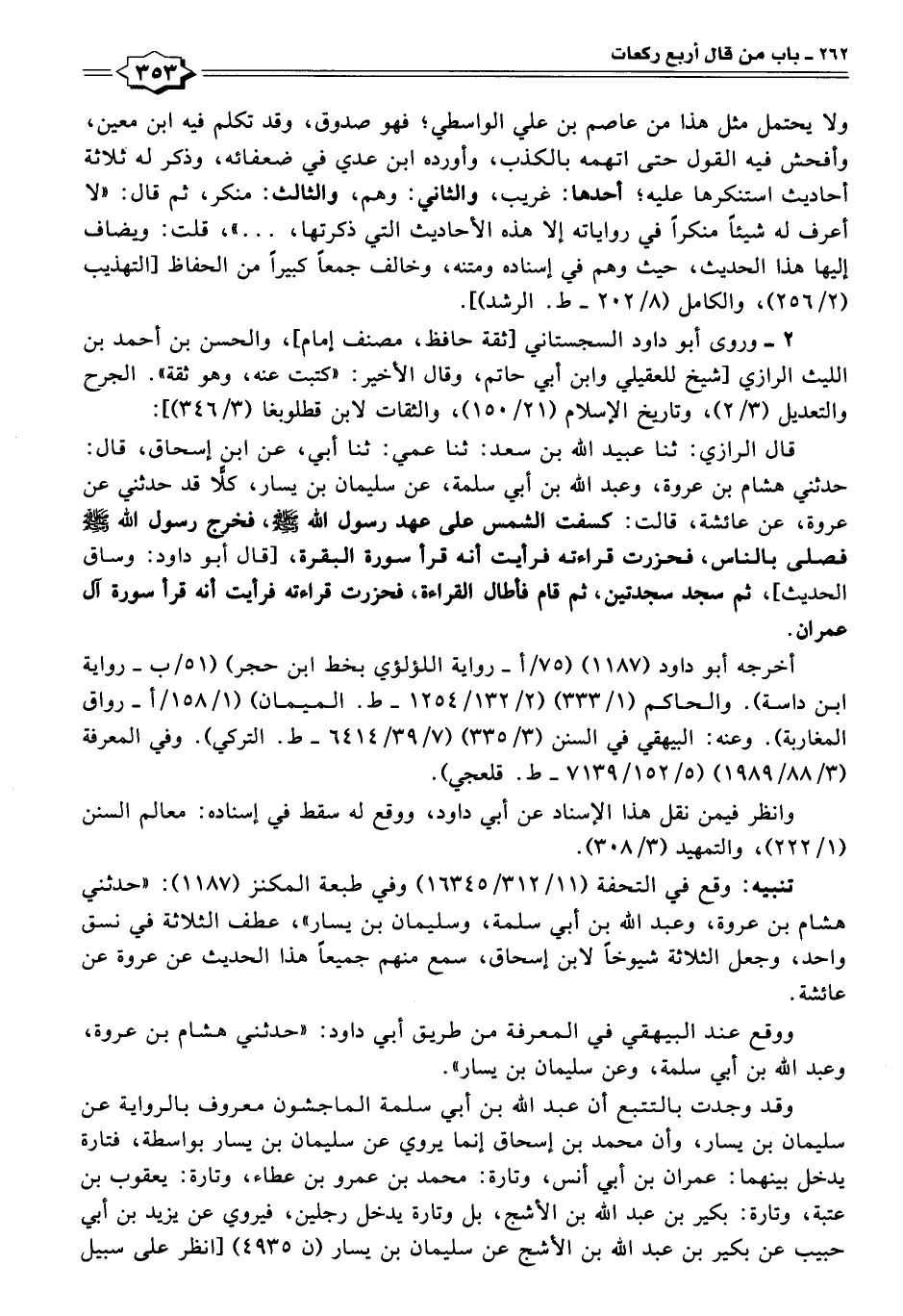 قال الرازي: ثنا عبيد اللَّه بن سعد: ثنا عمي: ثنا أبي، عن ابن إسحاق، قال: حدثني هشام بن عروة، وعبد اللَّه بن أبي سلمة، عن سليمان بن يسار، كلًّا قد حدثني عن عروة، عن عائشة، قالت: كسفت الشمس على عهد رسول اللَّه -صلى اللَّه عليه وسلم-، فخرج رسول اللَّه -صلى اللَّه عليه وسلم- فصلى بالناس، فحزرت قراءته فرأيت أنه قرأ سورة البقرة، [قال أبو داود: وساق الحديث]، ثم سجد سجدتين، ثم قام فأطال القراءة، فحزرت قراءته فرأيت أنه قرأ سورة آل عمران.