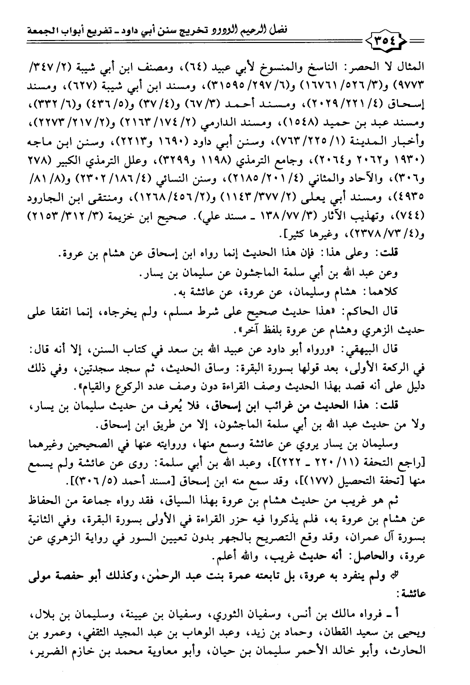 ثم هو غريب من حديث هشام بن عروة بهذا السياق، فقد رواه جماعة من الحفاظ عن هشام بن عروة به، فلم يذكروا فيه حزر القراءة في الأولى بسورة البقرة، وفي الثانية بسورة آل عمران، وقد وقع التصريح بالجهر بدون تعيين السور في رواية الزهري عن عروة، والحاصل: أنه حديث غريب، واللَّه أعلم.