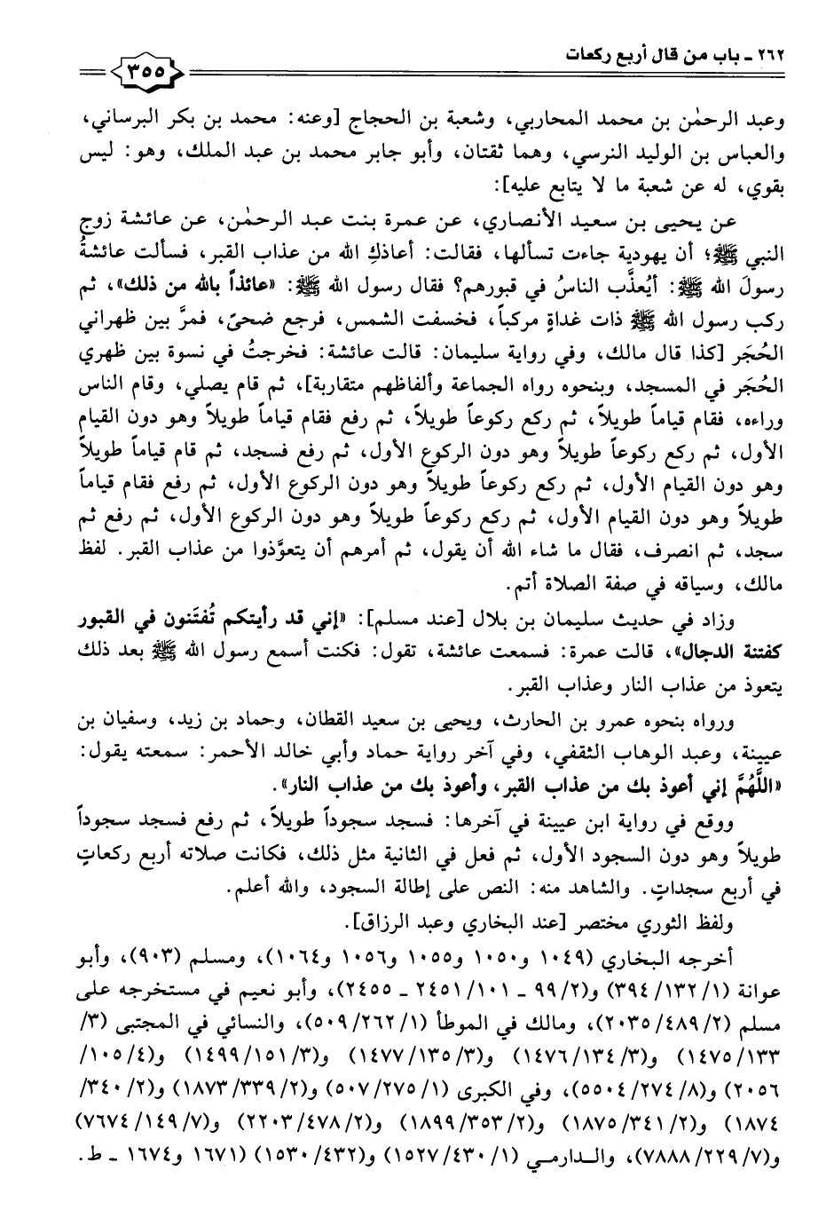 عن يحيى بن سعيد الأنصاري، عن عمرة بنت عبد الرحمن، عن عائشة زوج النبي -صلى اللَّه عليه وسلم-؛ أن يهودية جاءت تسألها، فقالت: أعاذكِ اللَّه من عذاب القبر، فسألت عائشةُ رسولَ اللَّه -صلى اللَّه عليه وسلم-: أيُعذَّب الناسُ في قبورهم؛ فقال رسول اللَّه -صلى اللَّه عليه وسلم-: "عائذًا باللَّه من ذلك"، ثم ركب رسول اللَّه -صلى اللَّه عليه وسلم- ذات غداةٍ مركبًا، فخسفت الشمس، فرجع ضحًى، فمرَّ بين ظهراني الحُجَر [كذا قال مالك، وفي رواية سليمان: قالت عائشة: فخرجتُ في نسوة بين ظهري الحُجَر في المسجد، وبنحوه رواه الجماعة وألفاظهم متقاربة]، ثم قام يصلي، وقام الناس وراءه، فقام قيامًا طويلًا، ثم ركع ركوعًا طويلًا، ثم رفع فقام قيامًا طويلًا وهو دون القيام الأول، ثم ركع ركوعًا طويلًا وهو دون الركوع الأول، ثم رفع فسجد، ثم قام قيامًا طويلًا وهو دون القيام الأول، ثم ركع ركوعًا طويلًا وهو دون الركوع الأول، ثم رفع فقام قيامًا طويلًا وهو دون القيام الأول، ثم ركع ركوعًا طويلًا وهو دون الركوع الأول، ثم رفع ثم سجد، ثم انصرف، فقال ما شاء اللَّه أن يقول، ثم أمرهم أن يتعوَّذوا من عذاب القبر. لفظ مالك، وسياقه في صفة الصلاة أتم.