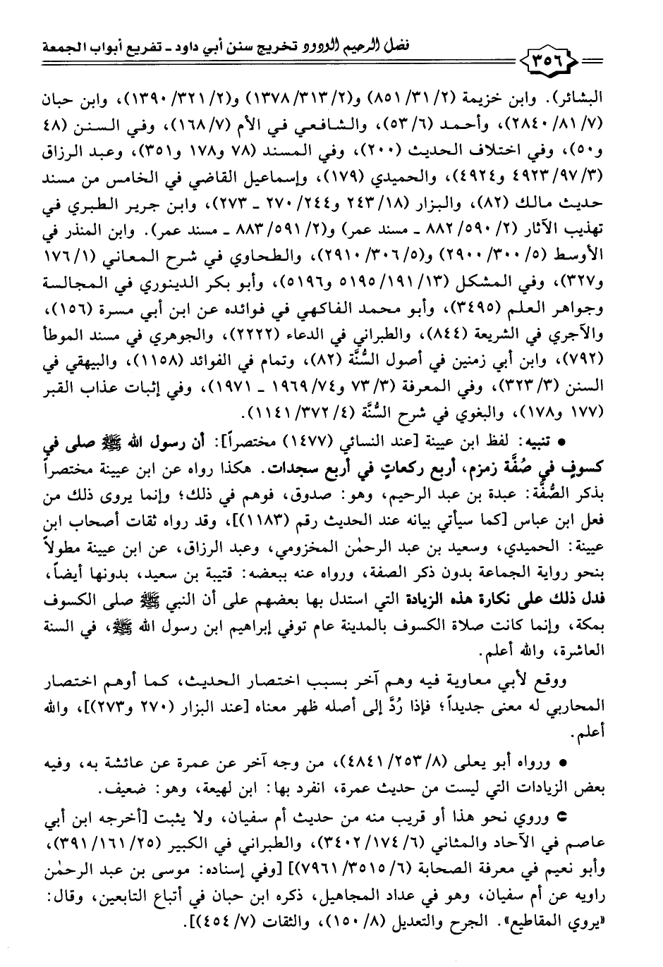 • تنبيه: لفظ ابن عيينة [عند النسائي (١٤٧٧) مختصرًا]: أن رسول اللَّه -صلى اللَّه عليه وسلم- صلى في كسوفٍ في صُفَّة زمزم، أربع ركعاتٍ في أربع سجدات. هكذا رواه عن ابن عيينة مختصرًا بذكر الصُّفُّة: عبدة بن عبد الرحيم، وهو: صدوق، فوهم في ذلك؛ وإنما يروى ذلك من فعل ابن عباس [كما سيأتي بيانه عند الحديث رقم (١١٨٣)]، وقد رواه ثقات أصحاب ابن عيينة: الحميدي، وسعيد بن عبد الرحمن المخزومي، وعبد الرزاق، عن ابن عيينة مطولًا بنحو رواية الجماعة بدون ذكر الصفة، ورواه عنه ببعضه: قتيبة بن سعيد، بدونها أيضًا، فدل ذلك على نكارة هذه الزيادة التي استدل بها بعضهم على أن النبي -صلى اللَّه عليه وسلم- صلى الكسوف بمكة، وإنما كانت صلاة الكسوف بالمدينة عام توفي إبراهيم ابن رسول اللَّه -صلى اللَّه عليه وسلم-، في السنة العاشرة، واللَّه أعلم.