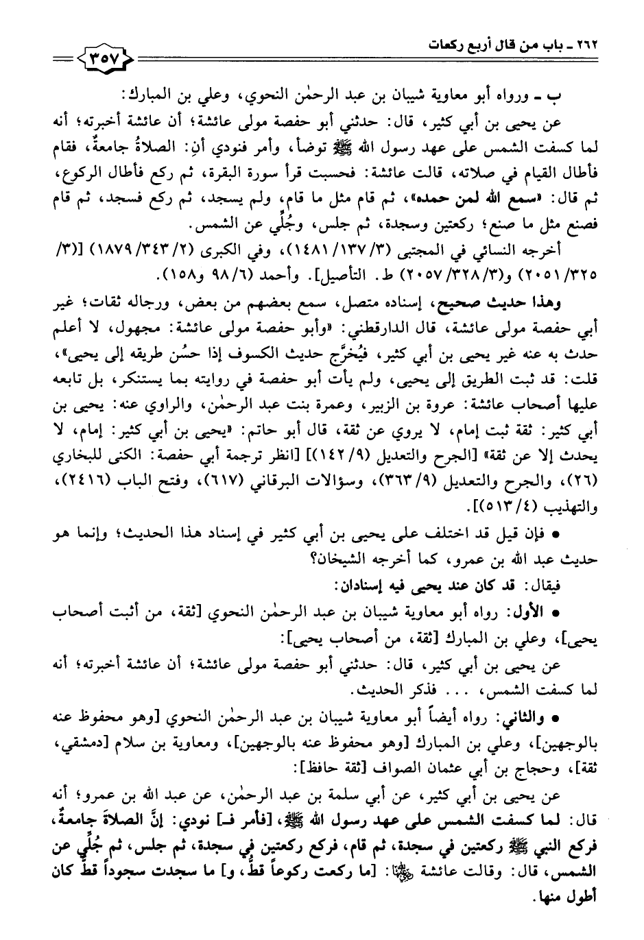 وهذا حديث صحيح، إسناده متصل، سمع بعضهم من بعض، ورجاله ثقات؛ غير أبي حفصة مولى عائشة، قال الدارقطني: "وأبو حفصة مولى عائشة: مجهول، لا أعلم حدث به عنه غير يحيى بن أبي كثير، فيُخرَّج حديث الكسوف إذا حسُن طريقه إلى يحيى"، قلت: قد ثبت الطريق إلى يحيى، ولم يات أبو حفصة في روايته بما يستنكر، بل تابعه عليها أصحاب عائشة: عروة بن الزبير، وعمرة بنت عبد الرحمن، والراوي عنه: يحيى بن أبي كثير: ثقة ثبت إمام، لا يروي عن ثقة، قال أبو حاتم: "يحيى بن أبي كثير: إمام، لا يحدث إِلا عن ثقة" [الجرح والتعديل (٩/ ١٤٢)] [انظر ترجمة أبي حفصة: الكنى للبخاري (٢٦)، والجرح والتعديل (٩/ ٣٦٣)، وسؤالات البرقاني (٦١٧)، وفتح الباب (٢٤١٦)، والتهذيب (٤/ ٥١٣)].