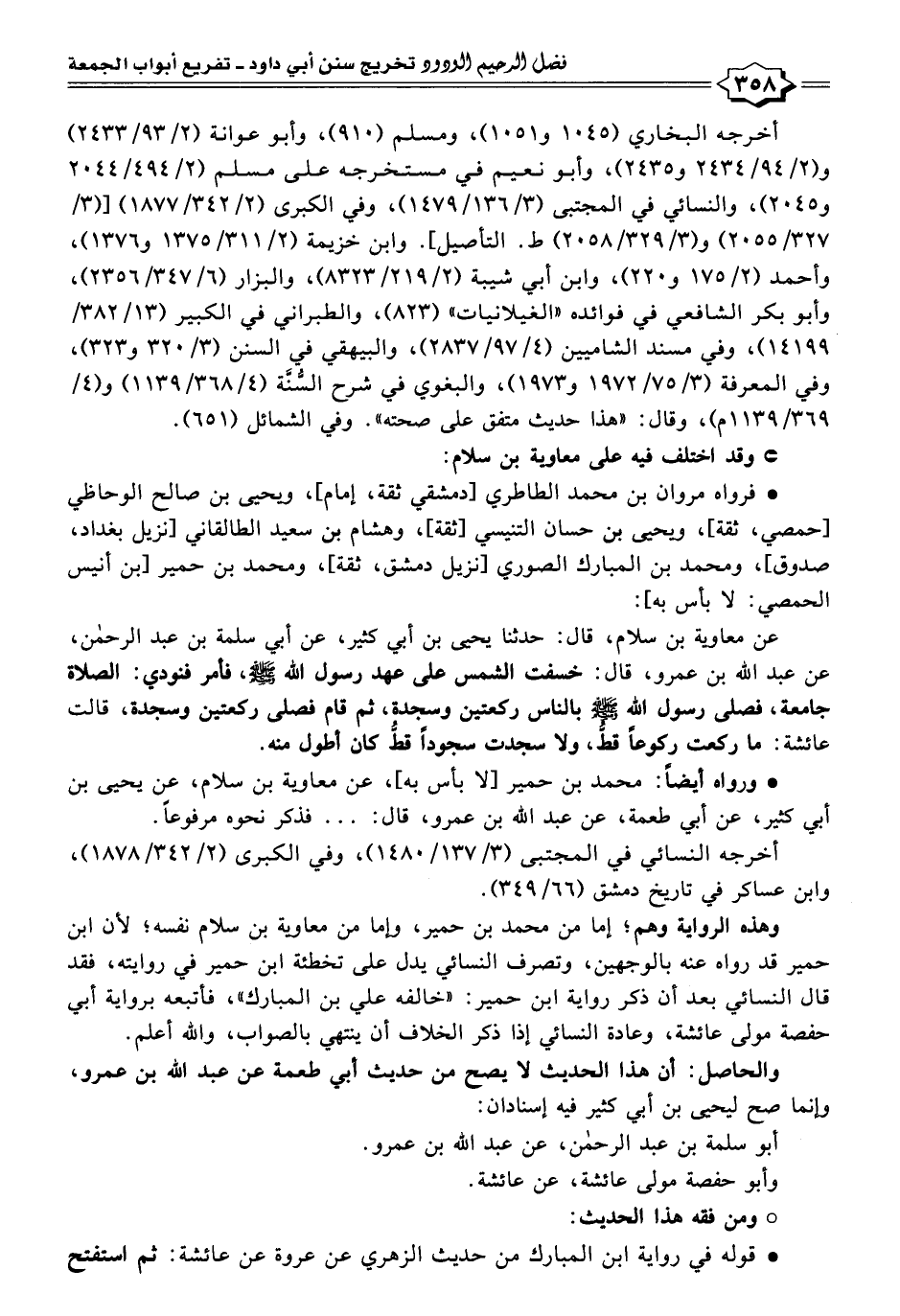 وهذه الرواية وهم؛ إما من محمد بن حمير، وإما من معاوية بن سلام نفسه؛ لأن ابن حمير قد رواه عنه بالوجهين، وتصرف النسائي يدل على تخطئة ابن حمير في روايته، فقد قال النسائي بعد أن ذكر رواية ابن حمير: "خالفه علي بن المبارك"، فأتبعه برواية أبي حفصة مولى عائشة، وعادة النسائي إذا ذكر الخلاف أن ينتهي بالصواب، واللَّه أعلم.