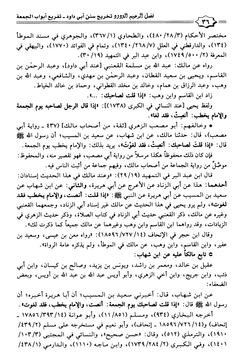 قال ابن عبد البر في التمهيد (١٩/ ٢٩): "وعند مالك في هذا الحديث إسنادان: أحدهما: هذا عن أبي الزناد عن الأعرج عن أبي هريرة، والثاني: عن ابن شهاب عن سعيد بن المسيب عن أبي هريرة عن النبي - صلى الله عليه وسلم -: "إذا قلت: أنصت، والإمام يخطب فقد لغوت"، ولم يرو يحيى في هذا الحديث عن مالك غير إسناد أبي الزناد، وجمعهما القعنبي وغيره عن مالك، ذكر القعنبي حديث أبي الزناد في كتاب الصلاة، وذكر حديث الزهري في الزيادات، وقد رواهما ابن القاسم وابن وهب وغيرهما عن مالك جميعًا كما ذكرت لك".