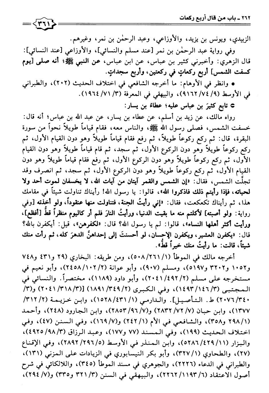 رواه مالك، عن زيد بن أسلم، عن عطاء بن يسار، عن عبد اللَّه بن عباس؛ أنه قال: خسفت الشمس، فصلى رسول اللَّه -صلى اللَّه عليه وسلم-، والناس معه، فقام قيامًا طويلًا نحوًا من سورة البقرة، قال: ثم ركع ركوعًا طويلًا، ثم رفع فقام قيامًا طويلًا وهو دون القيام الأول، ثم ركع ركوعًا طويلًا وهو دون الركوع الأول، ثم سجد، ثم قام قيامًا طويلًا وهو دون القيام الأول، ثم ركع ركوعًا طويلًا وهو دون الركوع الأول، ثم رفع فقام قيامًا طويلًا وهو دون القيام الأول، ثم ركع ركوعًا طويلًا وهو دون الركوع الأول، ثم سجد، ثم انصرف وقد تجلَّت الشمس، فقال: "إن الشمس والقمر آيتان من آيات اللَّه، لا يخسفان لموت أحد ولا لحياته، فإذا رأيتم ذلك فاذكروا اللَّه"، قالوا: يا رسول اللَّه! رأيناك تناولت شيئًا في مقامك هذا، ثم رأيناك تكعكعت، فقال: "إني رأيتُ الجنة، فتناولت منها عنقودًا، ولو أخذته [وفي رواية: ولو أصبته] لأكلتم منه ما بقيت الدنيا، ورأيتُ النارَ فلم أر كاليوم منظرًا قطُّ [أفظع]، ورأيت أكثر أهلها النساء"، قالوا: لم يا رسول اللَّه؛ قال: "لكفرهن"، قيل: أيكفرن باللَّه؛ قال: "يكفرن العشير، ويكفرن الإحسان، لو أحسنتَ الى إحداهنَّ الدهرَ كله، ثم رأت منك شيئًا، قالت: ما رأيتُ منك خيرًا قطُّ".
