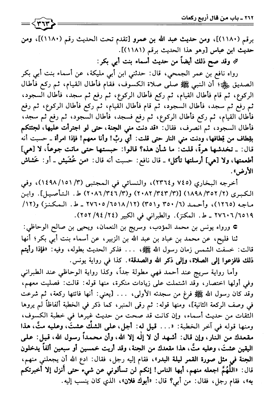 رواه نافع بن عمر الجمحي، قال: حدثني ابن أبي مليكة، عن أسماء بنت أبي بكر الصديق -رضي اللَّه عنهما-؛ أن النبي -صلى اللَّه عليه وسلم- صلى صلاة الكسوف، فقام فأطال القيام، ثم ركع فأطال الركوع، ثم قام فأطال القيام، ثم ركع فأطال الركوع، ثم رفع ثم سجد، فأطال السجود، ثم رفع ثم سجد، فأطال السجود، ثم قام فأطال القيام، ثم ركع فأطال الركوع، ثم رفع فأطال القيام، ثم ركع فأطال الركوع، ثم رفع فسجد، فأطال السجود، ثم رفع ثم سجد، فأطال السجود، ثم انصرف، فقال: "قد دنت مني الجنة، حتى لو اجترأت عليها، لجئتكم بقِطاف من قِطافها، ودنت مني النار حتى قلت: أي ربِّ! وأنا معهم! فإذا امرأة -حسبت أنه قال:- تخدشها هرةٌ، قلت: ما شأن هذه؛ قالوا: حبستها حتى ماتت جوعًا، لا [هي] أطعمتها، ولا [هي] أرسلتها تأكل" -قال نافع: حسبت أنه قال: "من خُشَيش- أو: خَشاش الأرض".