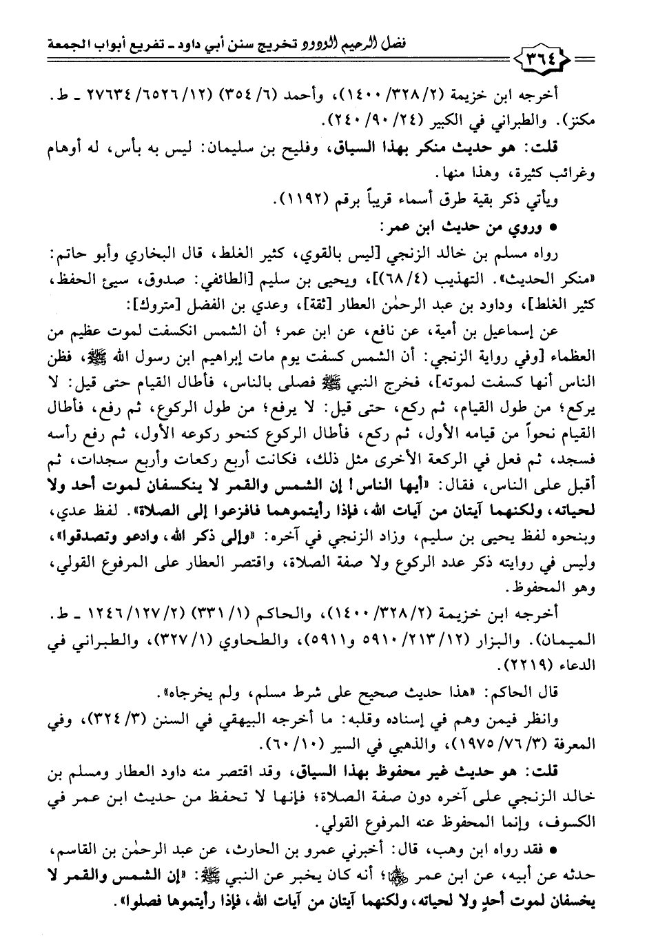 قلت: هو حديث غير محفوظ بهذا السياق، وقد اقتصر منه داود العطار ومسلم بن خالد الزنجي على آخره دون صفة الصلاة؛ فإنها لا تحفظ من حديث ابن عمر في الكسوف، وإنما المحفوظ عنه المرفوع القولي.
