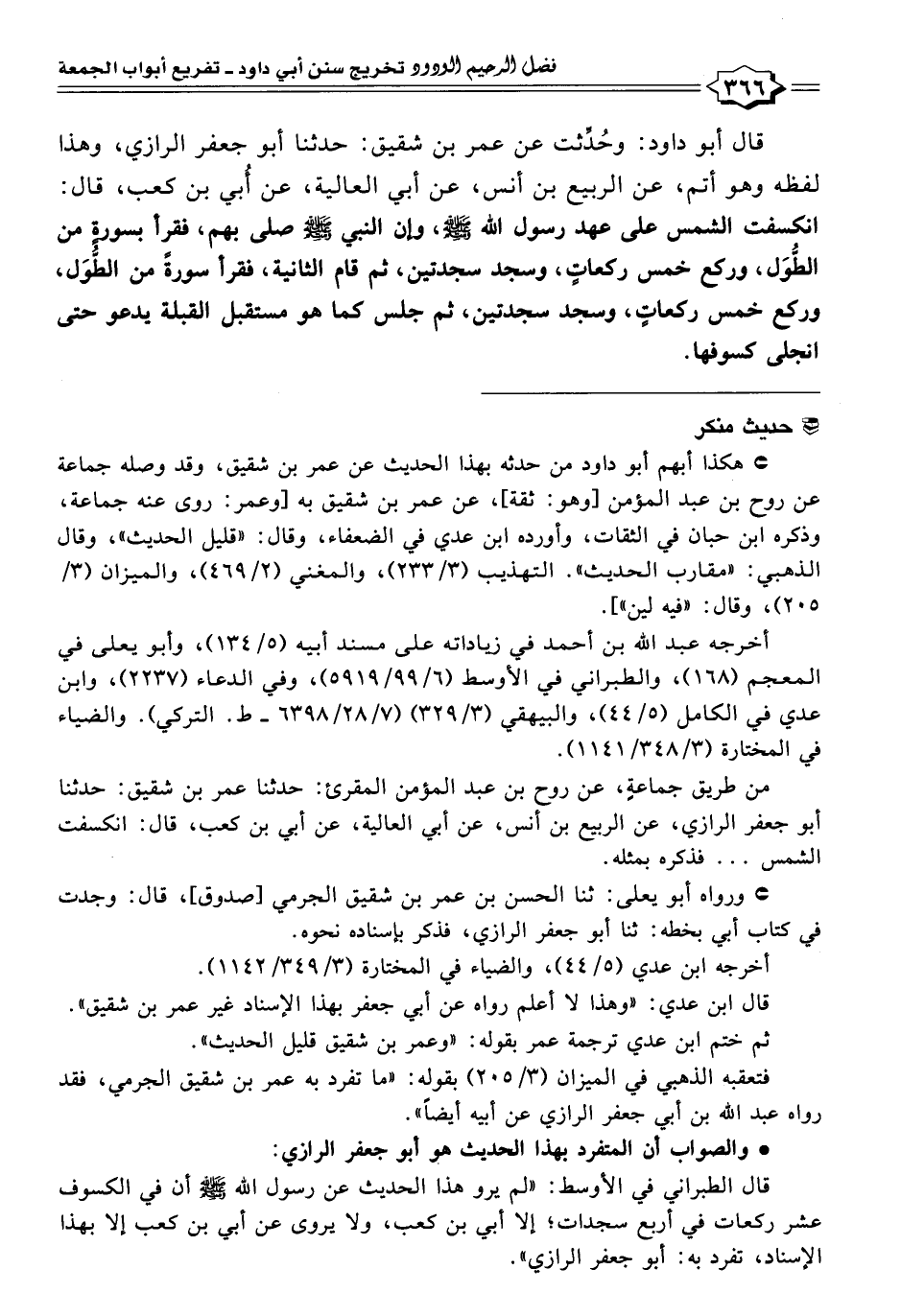 قال الطبراني في الأوسط: "لم يرو هذا الحديث عن رسول اللَّه -صلى اللَّه عليه وسلم- أن في الكسوف عشر ركعات في أربع سجدات؛ إِلا أبي بن كعب، ولا يروى عن أبي بن كعب إِلا بهذا الإسناد، تفرد به: أبو جعفر الرازي".