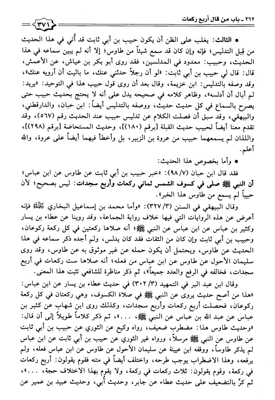 فقد قال ابن حبان (٧/ ٩٨): "خبر حبيب بن أبي ثابت عن طاوس عن ابن عباس؛ أن النبي -صلى اللَّه عليه وسلم- صلى في كسوف الشمس ثماني ركعات وأربع سجدات: ليس بصحيح؛ لأن حبيبًا لم يسمع من طاوس هذا الخبر".