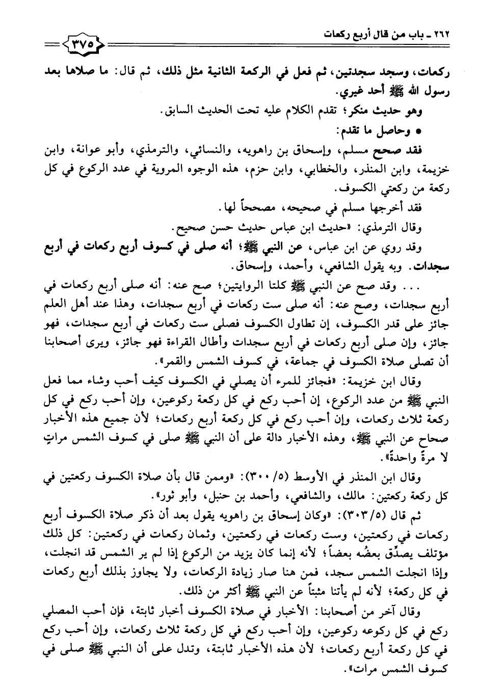 ثم قال (٥/ ٣٠٣): "وكان إسحاق بن راهويه يقول بعد أن ذكر صلاة الكسوف أربع ركعات في ركعتين، وست ركعات في ركعتين، وثمان ركعات في ركعتين: كل ذلك مؤتلف يصدِّق بعضُه بعضًا؛ لأنه إنما كان يزيد من الركوع إذا لم ير الشمس قد انجلت، واذا انجلت الشمس سجد، فمن هنا صار زيادة الركعات، ولا يجاوز بذلك أربع ركعات في كل ركعة؛ لأنه لم يأتنا مثبتًا عن النبي -صلى اللَّه عليه وسلم- أكثر من ذلك.