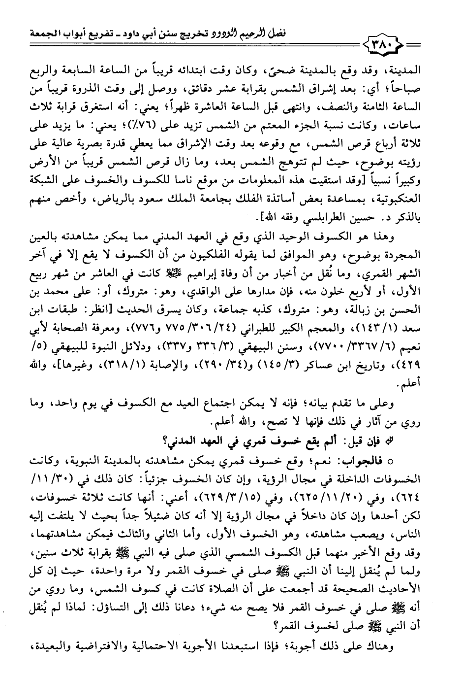 ° فالجواب: نعم؛ وقع خسوف قمري يمكن مشاهدته بالمدينة النبوية، وكانت الخسوفات الداخلة في مجال الرؤية، صمان كان الخسوف جزئيًا: كان ذلك في (٣٠/ ١١/ ٦٢٤)، وفي (٢٠/ ١١/ ٦٢٥)، وفي (١٥/ ٣/ ٦٢٩)، أعني: أنها كانت ثلاثة خسوفات، لكن أحدها وإن كان داخلآ في مجال الرؤية إلا أنه كان ضئيلًا جدًا بحيث لا يلتفت إليه الناس، ويصعب مشاهدته، وهو الخسوف الأول، وأما الثاني والثالث فيمكن مشاهدتهما، وقد وقع الأخير منهما قبل الكسوف الشمسي الذي صلى فيه النبي -صلى اللَّه عليه وسلم- بقرابة ثلاث سنين، ولما لم يُنقل إلينا أن النبي -صلى اللَّه عليه وسلم- صلى في خسوف القمر ولا مرة واحدة، حيث إن كل الأحاديث الصحيحة قد أجمعت على أن الصلاة كانت في كسوف الشمس، وما روي من أنه -صلى اللَّه عليه وسلم- صلى في خسوف القمر فلا يصح منه شيء؛ دعانا ذلك إلى التساؤل: لماذا لم يُنقل أن النبي -صلى اللَّه عليه وسلم- صلى لخسوف القمر؟