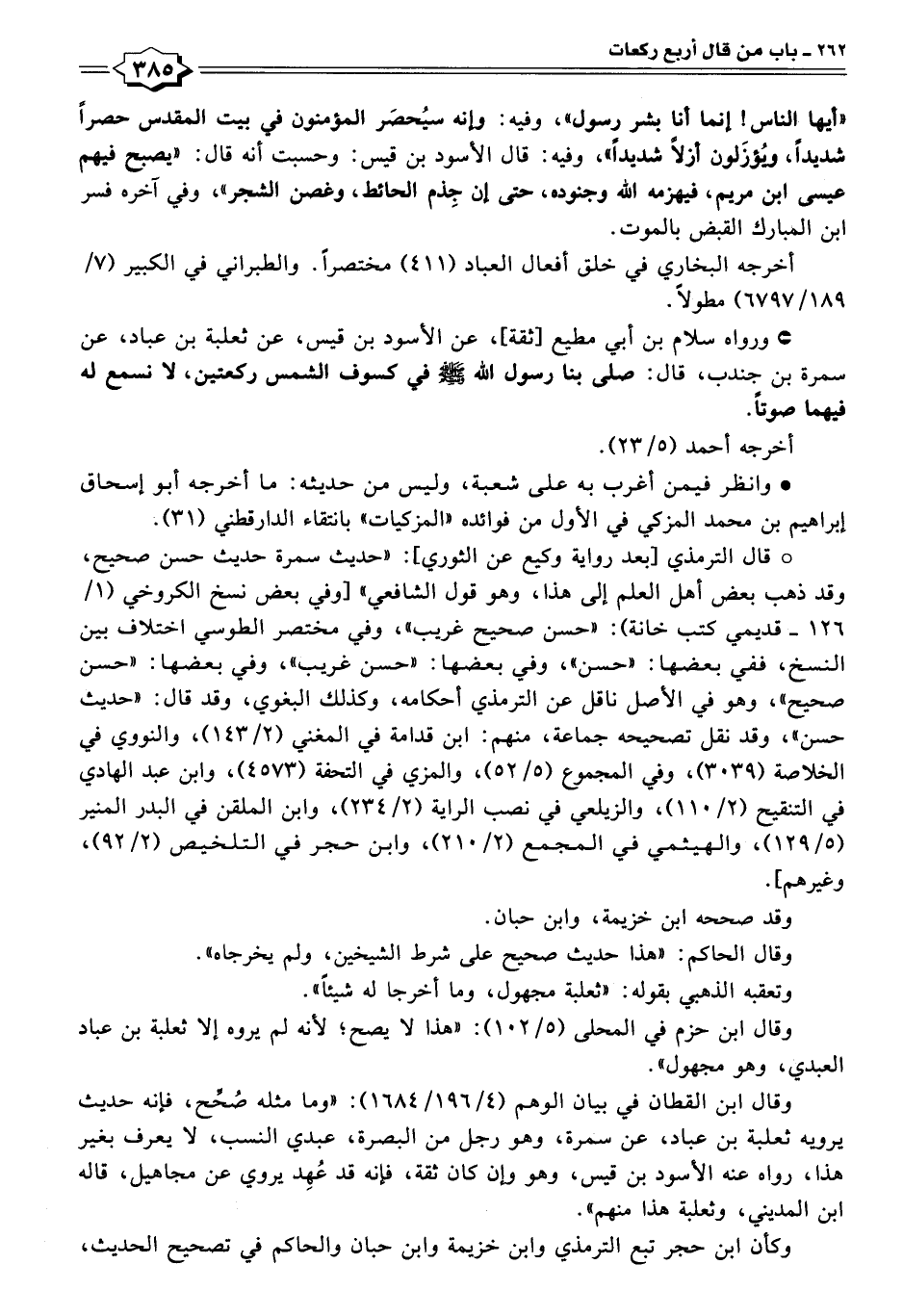 * ورواه سلام بن أبي مطيع [ثقة]، عن الأسود بن قيس، عن ثعلبة بن عباد، عن سمرة بن جندب، قال: صلى بنا رسول اللَّه -صلى اللَّه عليه وسلم- في كسوف الشمس ركعتين، لا نسمع له فيهما صوتًا.