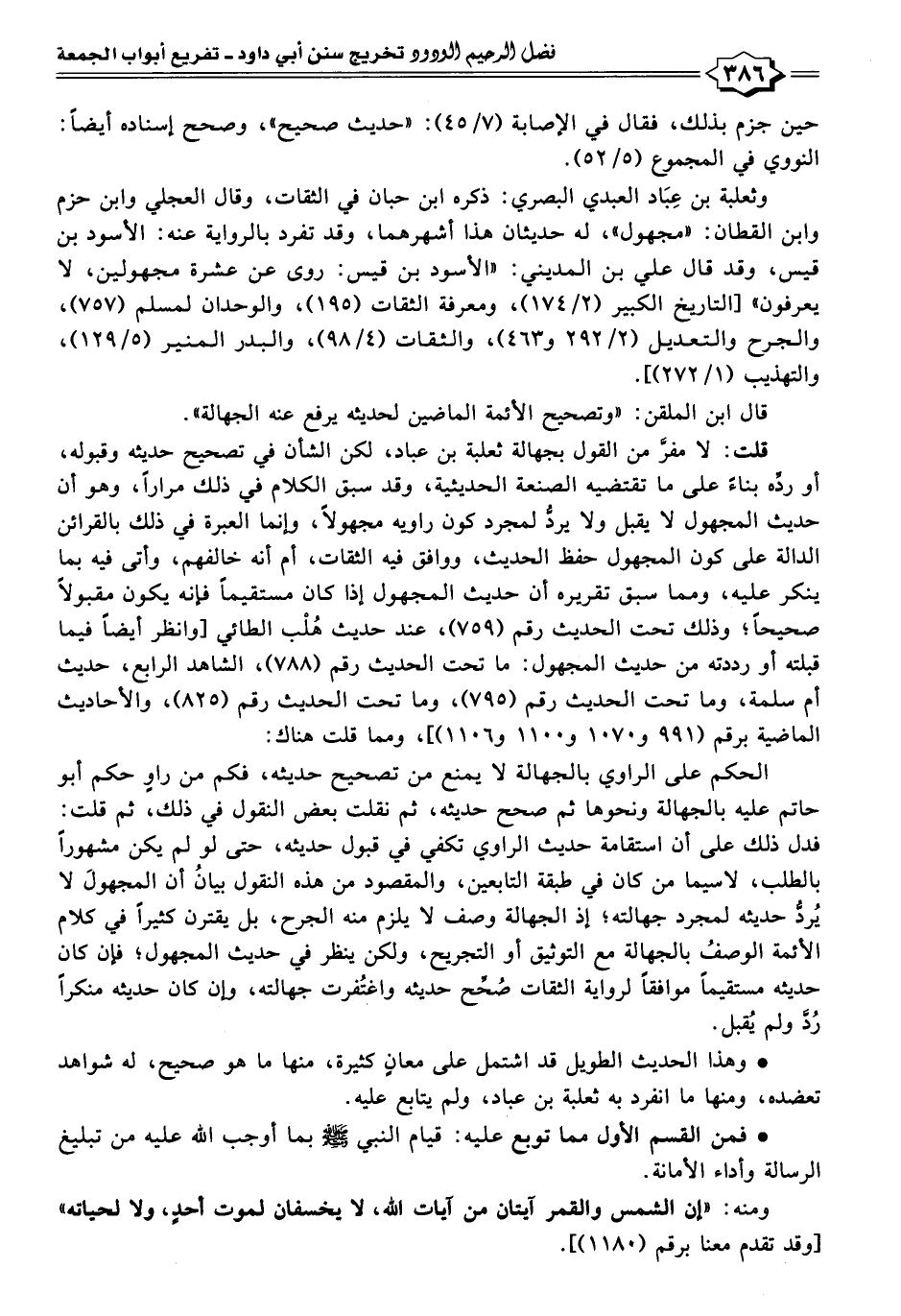 قلت: لا مفرَّ من القول بجهالة ثعلبة بن عباد، لكن الشأن في تصحيح حديثه وقبوله، أو ردِّه بناءً على ما تقتضيه الصنعة الحديثية، وقد سبق الكلام في ذلك مرارًا، وهو أن حديث المجهول لا يقبل ولا يردُّ لمجرد كون راويه مجهولًا، وإنما العبرة في ذلك بالقرائن الدالة على كون المجهول حفظ الحديث، ووافق فيه الثقات، أم أنه خالفهم، وأتى فيه بما ينكر عليه، ومما سبق تقريره أن حديث المجهول إذا كان مستقيمًا فإنه يكون مقبولًا صحيحًا؛ وذلك تحت الحديث رقم (٧٥٩)، عند حديث هُلْب الطائي [وانظر أيضًا فيما قبلته أو رددته من حديث المجهول: ما تحت الحديث رقم (٧٨٨)، الشاهد الرابع، حديث أم سلمة، وما تحت الحديث رقم (٧٩٥)، وما تحت الحديث رقم (٨٢٥)، والأحاديث الماضية برقم (٩٩١ و ١٠٧٠ و ١١٠٠ و ١١٠٦)]، ومما قلت هناك: