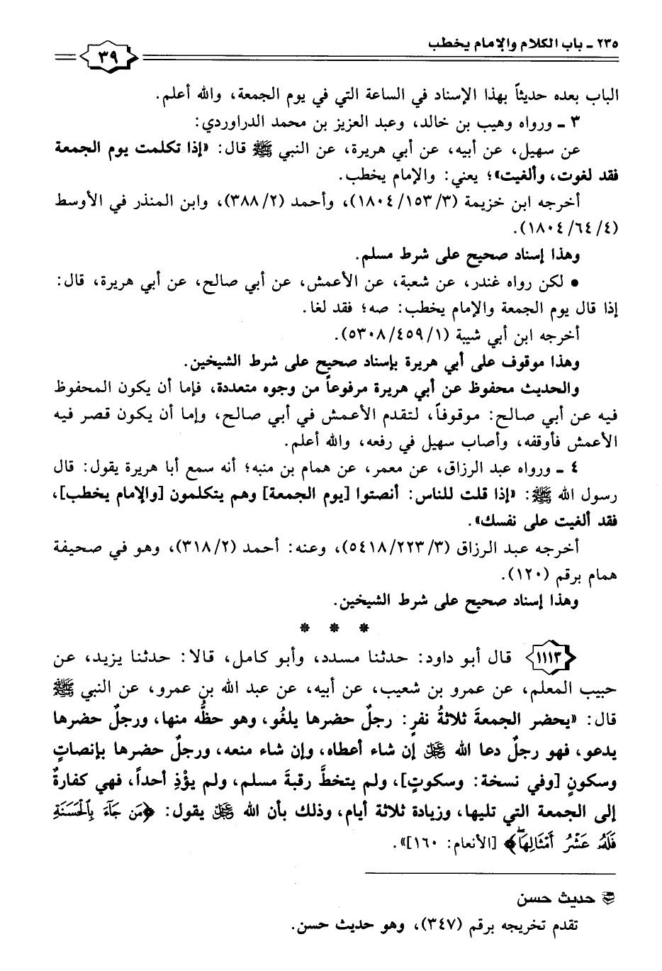 ١١١٣ - قال أبو داود: حدثنا مسدد، وأبو كامل، قالا: حدثنا يزيد، عن حبيب المعلم، عن عمرو بن شعيب، عن أبيه، عن عبد الله بن عمرو، عن النبي - صلى الله عليه وسلم - قال: "يحضر الجمعةَ ثلاثةُ نفرٍ: رجلٌ حضرها يلغُو، وهو حظُّه منها، ورجلٌ حضرها يدعو، فهو رجلٌ دعا الله عزَّ وجلَّ إن شاء أعطاه، وإن شاء منعه، ورجلٌ حضرها بإنصاتٍ وسكونٍ [وفي نسخة: وسكوتٍ]، ولم يتخطَّ رقبةَ مسلم، ولم يؤْذِ أحدًا، فهي كفارةٌ إلى الجمعة التي تليها، وزيادة ثلاثة أيام، وذلك بان الله عزَّ وجلَّ يقول: {مَنْ جَاءَ بِالْحَسَنَةِ فَلَهُ عَشْرُ أَمْثَالِهَا} [الأنعام: ١٦٠] ".