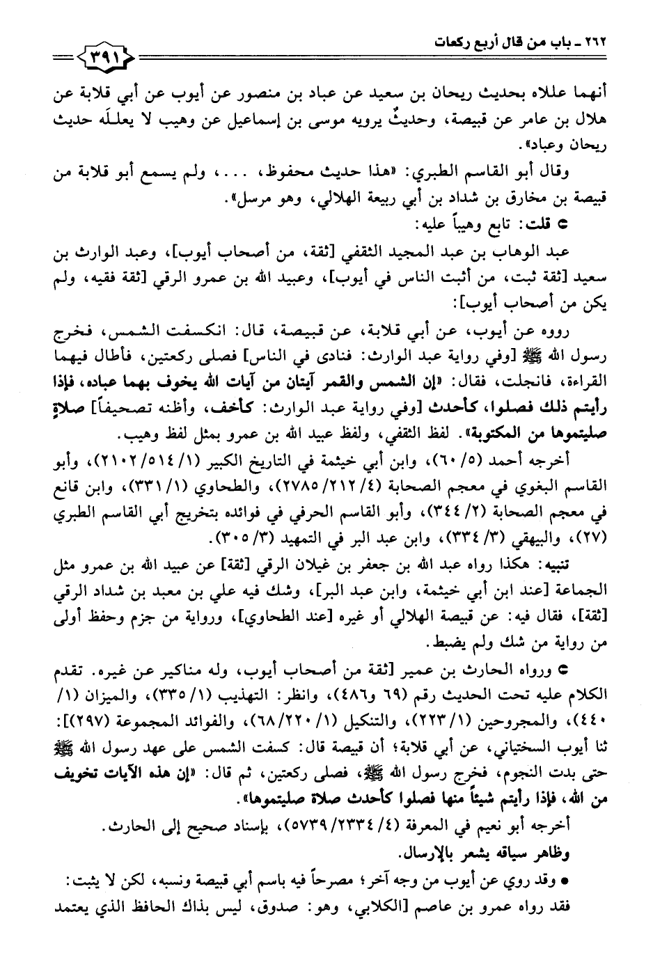 رووه عن أيوب، عن أبي قلابة، عن قبيصة، قال: انكسفت الشمس، فخرج رسول اللَّه -صلى اللَّه عليه وسلم-[وفي رواية عبد الوارث: فنادى في الناس] فصلى ركعتين، فأطال فيهما القراءة، فانجلت، فقال: "إن الشمس والقمر آيتان من آيات اللَّه يخوف بهما عباده، فإذا رأيتم ذلك فصلوا، كأحدث [وفي رواية عبد الوارث: كأخف، وأظنه تصحيفًا] صلاةٍ صليتموها من المكتوبة". لفظ الثقفي، ولفظ عبيد اللَّه بن عمرو بمثل لفظ وهيب.