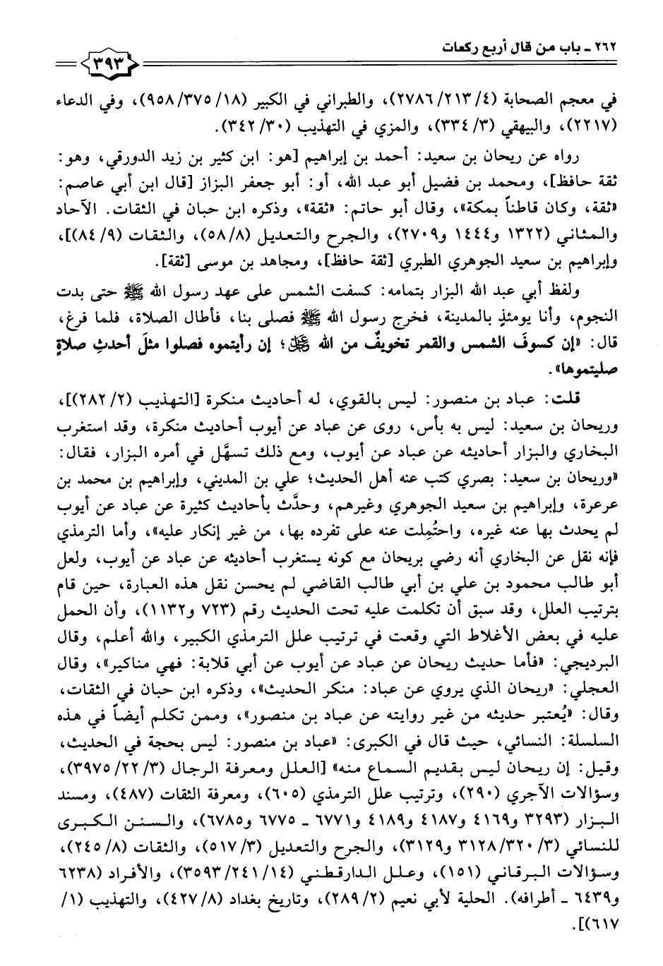 قلت: عباد بن منصور: ليس بالقوي، له أحاديث منكرة [التهذيب (٢/ ٢٨٢)]، وريحان بن سعيد: ليس به بأس، روى عن عباد عن أيوب أحاديث منكرة، وقد استغرب البخاري والبزار أحاديثه عن عباد عن أيوب، ومع ذلك تسهَّل في أمره البزار، فقال: "وريحان بن سعيد: بصري كتب عنه أهل الحديث؛ علي بن المديني، وإبراهيم بن محمد بن عرعرة، وإبراهيم بن سعيد الجوهري وغيرهم، وحدَّث بأحاديث كثيرة عن عباد عن أيوب لم يحدث بها عنه غيره، واحتُمِلت عنه على تفرده بها، من غير إنكار عليه"، وأما الترمذي فإنه نقل عن البخاري أنه رضي بريحان مع كونه يستغرب أحاديثه عن عباد عن أيوب، ولعل أبو طالب محمود بن علي بن أبي طالب القاضي لم يحسن نقل هذه العبارة، حين قام بترتيب العلل، وقد سبق أن تكلمت عليه تحت الحديث رقم (٧٢٣ و ١١٣٢)، وأن الحمل عليه في بعض الأغلاط التي وقعت في ترتيب علل الترمذي الكبير، واللَّه أعلم، وقال البرديجي: "فأما حديث ريحان عن عباد عن أيوب عن أبي قلابة: فهي مناكير"، وقال العجلي: "ريحان الذي يروي عن عباد: منكر الحديث"، وذكره ابن حبان في الثقات، وقال: "يُعتبر حديثه من غير روايته عن عباد بن منصور"، وممن تكلم أيضًا في هذه السلسلة: النسائي، حيث قال في الكبرى: "عباد بن منصور: ليس بحجة في الحديث، وقيل: إن ريحان ليس بقديم السماع منه" [العلل ومعرفة الرجال (٣/ ٢٢/ ٣٩٧٥)، وسؤالات الآجري (٢٩٠)، وترتيب علل الترمذي (٦٠٥)، ومعرفة الثقات (٤٨٧)، ومسند البزار (٣٢٩٣ و ٤١٦٩ و ٤١٨٧ و ٤١٨٩ و ٦٧٧١ - ٦٧٧٥ و ٦٧٨٥)، والسنن الكبرى للنسائي (٣/ ٣٢٠/ ٣١٢٨ و ٣١٢٩)، والجرح والتعديل (٣/ ٥١٧)، والثقات (٨/ ٢٤٥)، وسؤالات البرقاني (١٥١)، وعلل الدارقطني (١٤/ ٢٤١/ ٣٥٩٣)، والأفراد (٦٢٣٨ و ٦٤٣٩ - أطرافه). الحلية لأبي نعيم (٢/ ٢٨٩)، وتاريخ بغداد (٨/ ٤٢٧)، والتهذيب (١/ ٦١٧)].