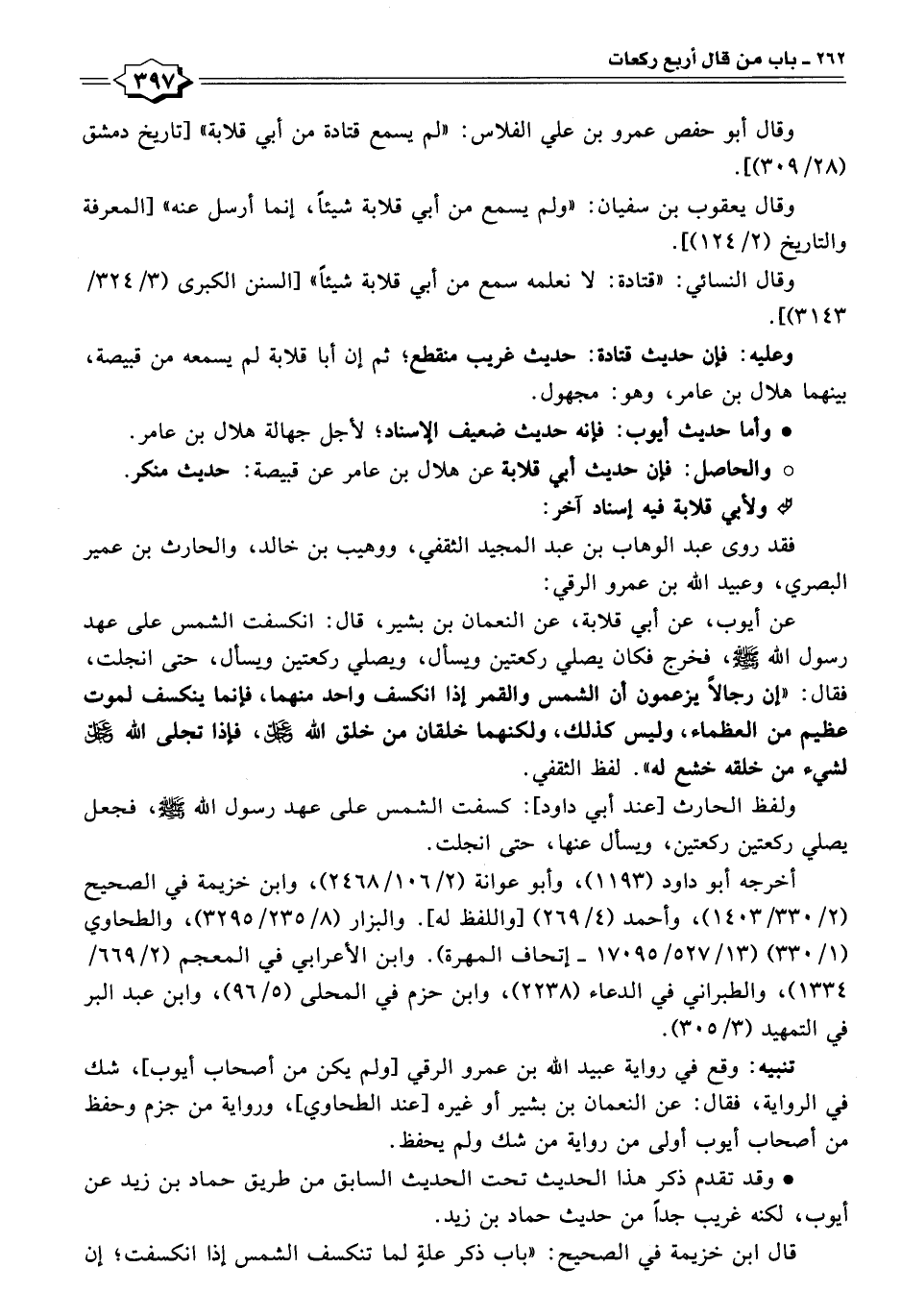 ولفظ الحارث [عند أبي داود]: كسفت الشمس على عهد رسول اللَّه -صلى اللَّه عليه وسلم-، فجعل يصلي ركعتين ركعتين، وشمال عنها، حتى انجلت.
