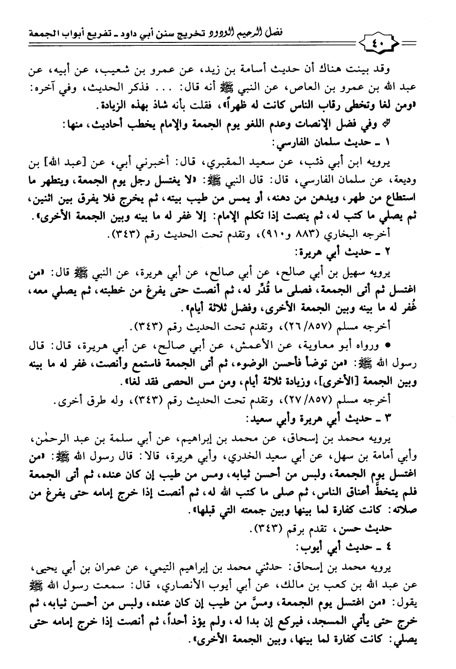 يرويه محمد بن إسحاق، عن محمد بن إبراهيم، عن أبي سلمة بن عبد الرحمن، وأبي أمامة بن سهل، عن أبي سعيد الخدري، وأبي هريرة، قالا: قال رسول الله - صلى الله عليه وسلم -: "من اغتسل يوم الجمعة، ولبس من أحسن ثيابه، ومس من طيب إن كان عنده، ثم أتى الجمعة فلم يتخطَّ أعناق الناس، ثم صلى ما كتب الله له، ثم أنصت إذا خرج إمامه حتى يفرغ من صلاته: كانت كفارة لما بينها وبين جمعته التي قبلها".