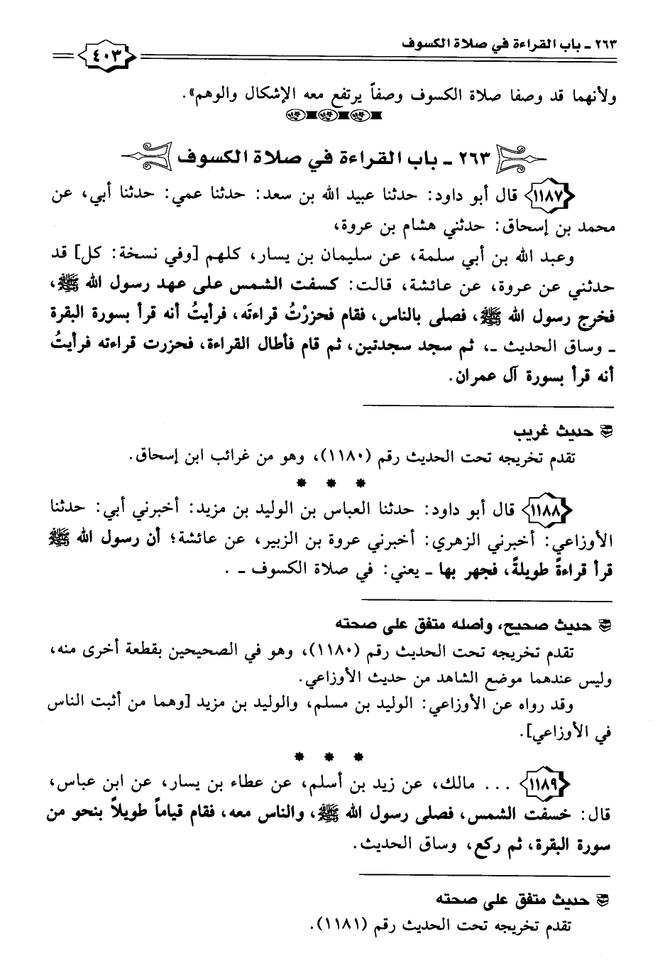 ١١٨٨ - قال أبو داود: حدثنا العباس بن الوليد بن مزيد: أخبرني أبي: حدثنا الأوزاعي: أخبرني الزهري: أخبرني عروة بن الزبير، عن عائشة؛ أن رسول اللَّه -صلى اللَّه عليه وسلم- قرأ قراءةً طويلةً، فجهر بها -يعني: في صلاة الكسوف-.
