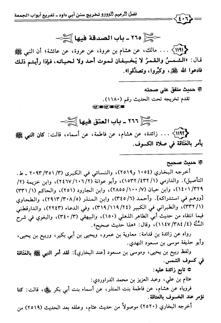 ١١٩٢ - . . . زائدة، عن هشام، عن فاطمة، عن أسماء، قالت: كان النبي -صلى اللَّه عليه وسلم- يأمر بالعَتَاقة في صلاة الكسوف.