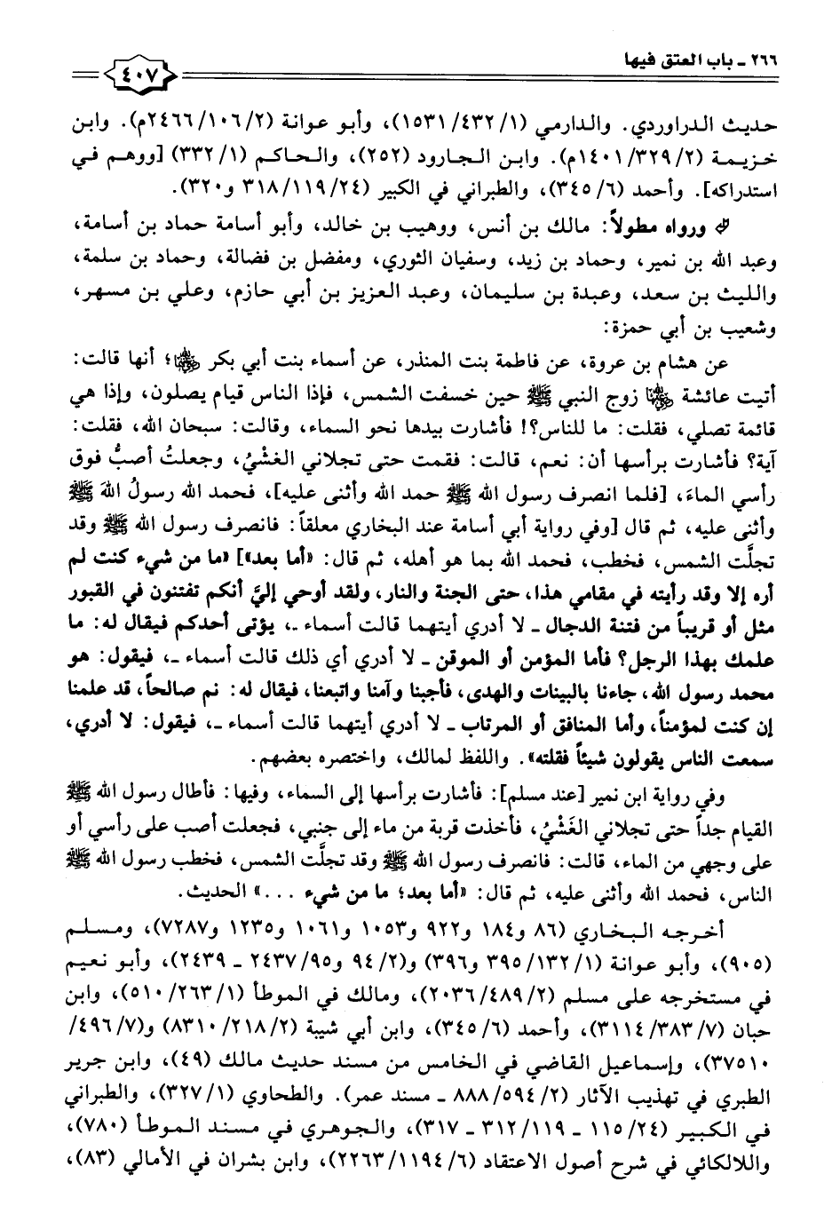 عن هشام بن عروة، عن فاطمة بنت المنذر، عن أسماء بنت أبي بكر -رضي اللَّه عنهما-؛ أنها قالت: أتيت عائشة -رضي اللَّه عنها- زوج النبي -صلى اللَّه عليه وسلم- حين خسفت الشمس، فإذا الناس قيام يصلون، وإذا هي قائمة تصلي، فقلت: ما للناس؟! فأشارت بيدها نحو السماء، وقالت: سبحان اللَّه، فقلت: آية؟ فأشارت برأسها أن: نعم، قالت: فقمت حتى تجلاني الغشْيُ، وجعلتُ أصبُّ فوق رأسي الماءَ [فلما انصرف رسول اللَّه -صلى اللَّه عليه وسلم- حمد اللَّه وأثنى عليه]، فحمد اللَّه رسولُ اللَّهَ -صلى اللَّه عليه وسلم- وأثنى عليه، ثم قال [وفي رواية أبي أسامة عند البخاري معلقًا: فانصرف رسول اللَّه -صلى اللَّه عليه وسلم- وقد تجلَّت الشمس، فخطب، فحمد اللَّه بما هو أهله، ثم قال: "أما بعد"] "ما من شيء كنت لم أره إلا وفد رأيته في مقامي هذا، حنى الجنة والنار، ولقد أوحي إليَّ أنكم نفننون في القبور مثل أو قريبًا من فتنة الدجال -لا أدري أيتهما قالت أسماء-، بؤتى أحدكم فيقال له: ما علمك بهذا الرجل؛ فأما المؤمن أو الموقن -لا أدري أي ذلك قالت أسماء-، فيقول: هو محمد رسول اللَّه، جاءنا بالبينات والهدى، فأجبنا وآمنا واتبعنا، فيقال له: نم صالحًا، قد علمنا إن كنت لمؤمنًا، وأما المنافق أو المرتاب -لا أدري أيتهما قالت أسماء-، فيقول: لا أدري، سمعت الناس يقولون شيئًا فقلته". واللفظ لمالك، واختصره بعضهم.