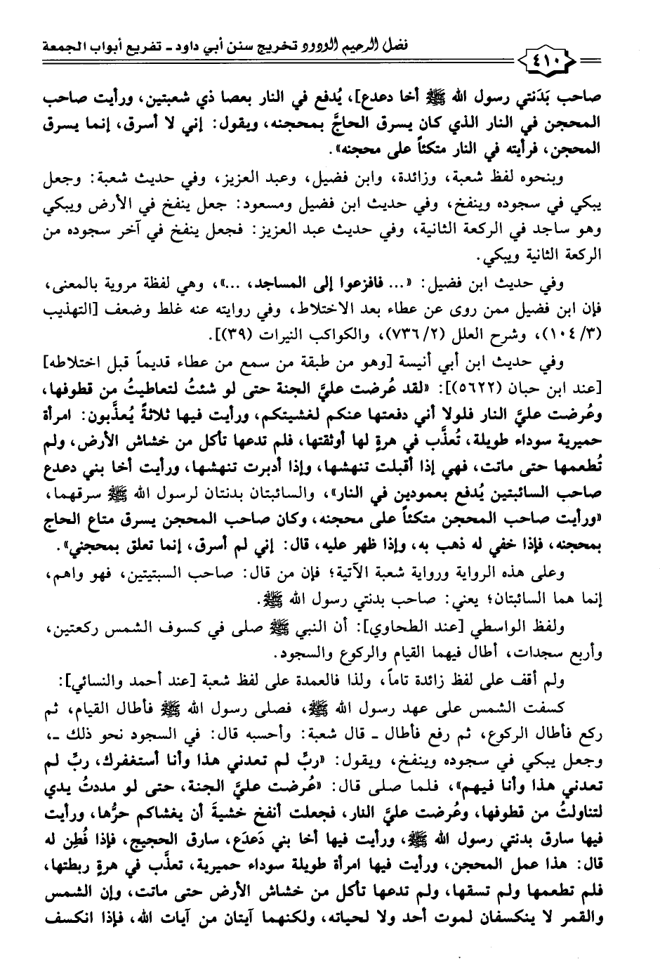 كسفت الشمس على عهد رسول اللَّه -صلى اللَّه عليه وسلم-، فصلى رسول اللَّه -صلى اللَّه عليه وسلم- فأطال القيام، ثم ركع فأطال الركوع، ثم رفع فأطال -قال شعبة: وأحسبه قال: في السجود نحو ذلك-، وجعل يبكي في سجوده وينفخ، ويقول: "ربِّ لم تعدني هذا وأنا أستغفرك، ربِّ لم تعدني هذا وأنا فيهم"، فلما صلى قال: "عُرضت عليَّ الجنة، حتى لو مددتُ يدي لتناولتُ من تطونها، وعُرضت عليَّ النار، فجعلت أنفخ خشيةَ أن يغشاكم حرُّها، ورأيت فيها سارق بدنتي رسول اللَّه -صلى اللَّه عليه وسلم-، ورأيت فيها أخا بني دَعدَع، سارق الحجيج، فإذا فُطِن له قال: هذا عمل المحجن، ورأيت فيها امرأة طويلة سوداء حميرية، تعذَّب في هرةٍ ربطتها، فلم تطعمها ولم تسقها، ولم تدعها تأكل من خشاش الأرض حتى ماتت، وإن الشمس والقمر لا ينكسفان لموت أحد ولا لحياته، ولكنهما آيتان من آيات اللَّه، فإذا انكسف