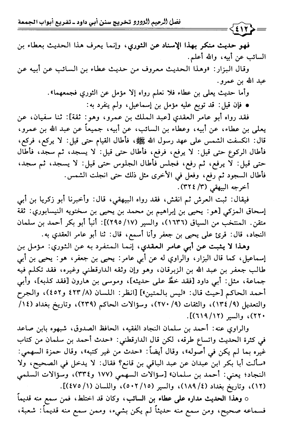 وهذا لا يثبت عن أبي عامر العقدي، إنما المتفرد به عن الثوري: مؤمل بن إسماعيل، كما قال البزار، والراوي له عن أبي عامر: يحيى بن جعفر، هو: يحيى بن أبي طالب جعفر بن عبد اللَّه بن الزبرقان، وهو وإن وثقه الدارقطني وغيره، فقد تكلم فيه جماعة، مثل: أبي داود [فقد خطَّ على حديثه]، وموسى بن هارون [فقد كذبه]، وأبي أحمد الحاكم [حيث قال: "ليس بالمتين"] [انظر: اللسان (٨/ ٤٢٣ و ٤٥٢)، والجرح والتعديل (٩/ ١٣٤)، والثقات (٩/ ٢٧٠)، وسؤالات الحاكم (٢٣٩)، وتاريخ بغداد (١٤/ ٢٢٥)، والسير (١٢/ ٦١٩)].