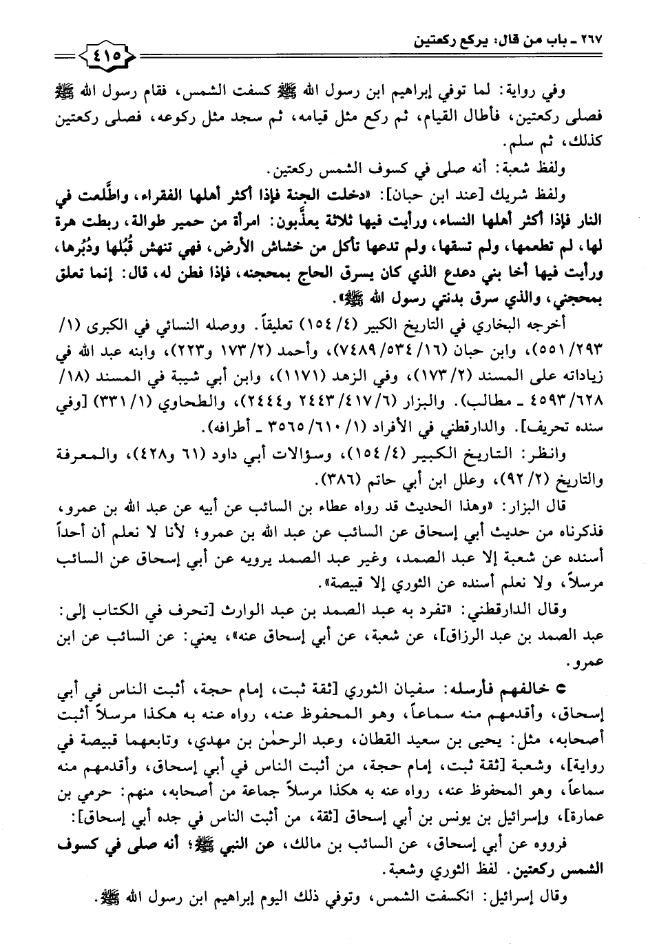 فرووه عن أبي إسحاق، عن السائب بن مالك، عن النبي -صلى اللَّه عليه وسلم-؛ أنه صلى في كسوف الشمس ركعتين. لفظ الثوري وشعبة.