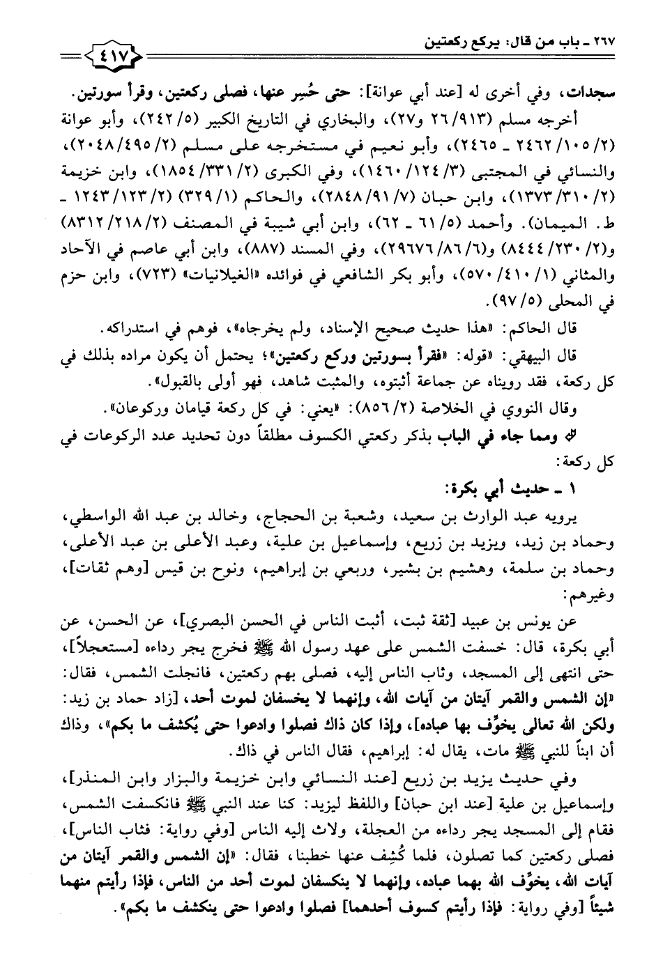 * ومما جاء في الباب بذكر ركتي الكسوف مطلقًا دون تحديد عدد الركوعات في كل ركعة: