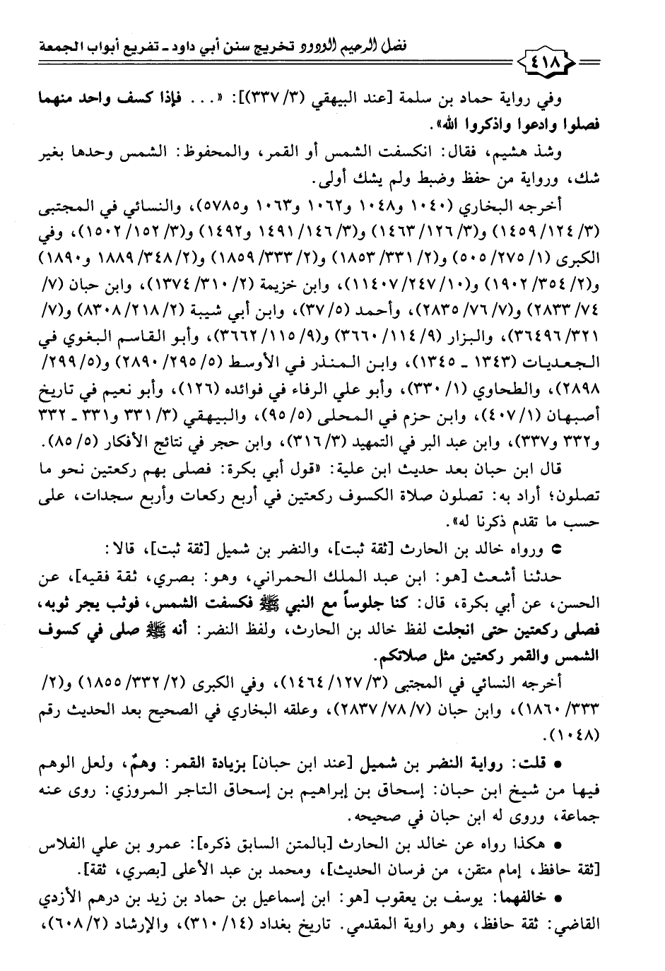 قال ابن حبان بعد حديث ابن علية: "قول أبي بكرة: فصلى بهم ركعتين نحو ما تصلون؛ أراد به: تصلون صلاة الكسوف ركعتين في أربع ركعات وأربع سجدات، على حسب ما تقدم ذكرنا له".