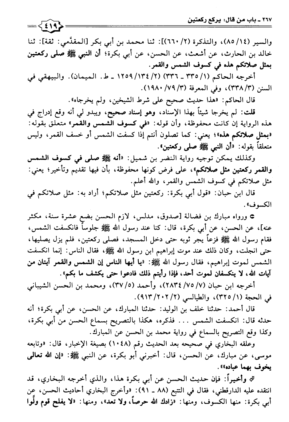 والسير (١٤/ ٨٥)، والتذكرة (٢/ ٦٦٠)]: ثنا محمد بن أبي بكر [المقدَّمي: ثقة]: ثنا خالد بن الحارث، عن أشعث، عن الحسن، عن أبي بكرة؛ أن النبي -صلى اللَّه عليه وسلم- صلى ركعتين بمثل صلاتكم هده في كسوف الشمس والقمر.