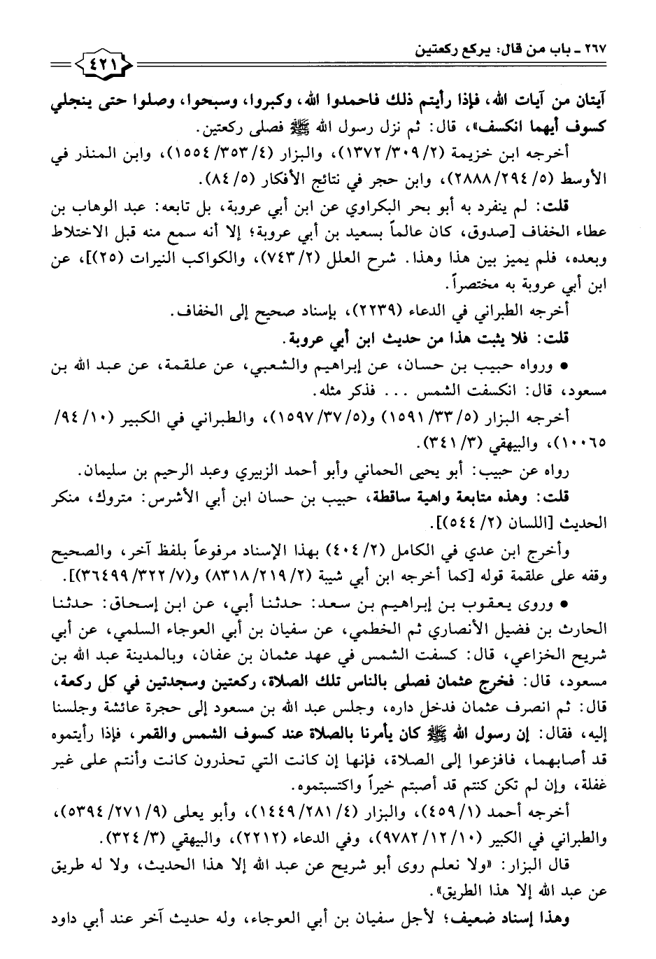 • وروى يعقوب بن إبراهيم بن سعد: حدثنا أبي، عن ابن إسحاق: حدثنا الحارث بن فضيل الأنصاري ثم الخطمي، عن سفيان بن أبي العوجاء السلمي، عن أبي شريح الخزاعي، قال: كسفت الشمس في عهد عثمان بن عفان، وبالمدينة عبد اللَّه بن مسعود، قال: فخرج عثمان فصلى بالناس تلك الصلاة، ركعتين وسجدتين في كل ركعة، قال: ثم انصرف عثمان فدخل داره، وجلس عبد اللَّه بن مسعود إلى حجرة عائشة وجلسنا إليه، فقال: ان رسول اللَّه -صلى اللَّه عليه وسلم- كان يأمرنا بالصلاة عند كسوف الشمس والقمر، فإذا رأيتموه قد أصابهما، فافزعوا إلى الصلاة، فإنها إن كانت التي تحذرون كانت وأنتم على غير غفلة، وإن لم تكن كنتم قد أصبتم خيرًا واكتسبتموه.