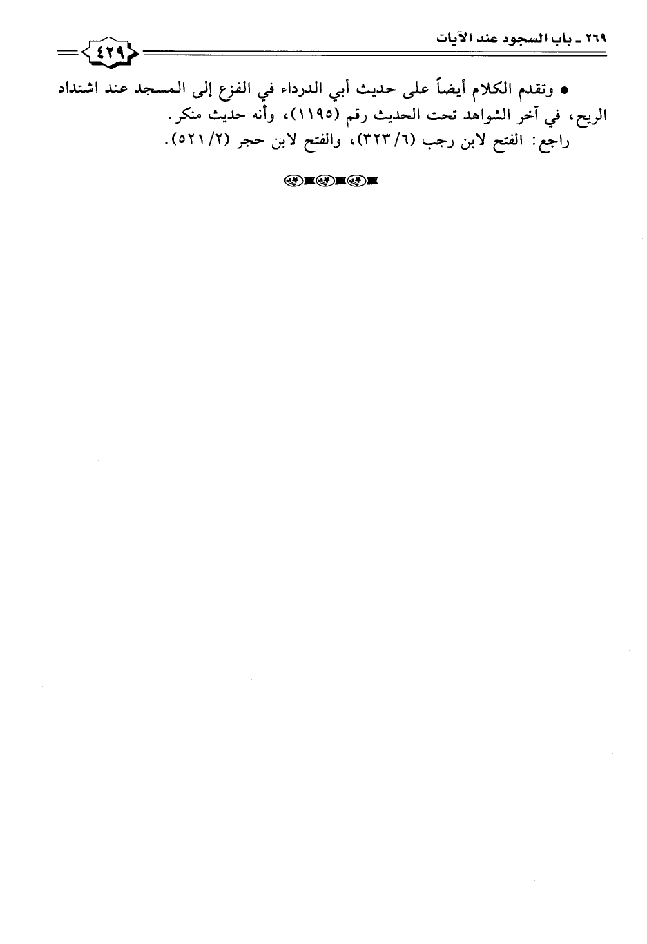 • وتقدم الكلام أيضًا على حديث أبي الدرداء في الفزع إلى المسجد عند اشتداد الريح، في آخر الشواهد تحت الحديث رقم (١١٩٥)، وأنه حديث منكر.