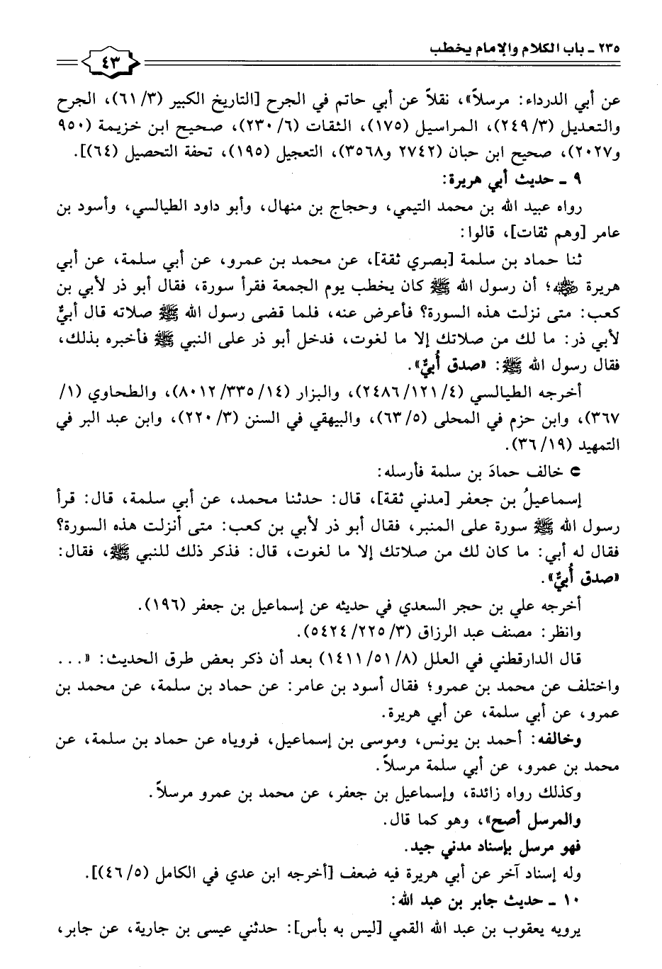 ثنا حماد بن سلمة [بصري ثقة]، عن محمد بن عمرو، عن أبي سلمة، عن أبي هريرة - رضي الله عنه -؛ أن رسول الله - صلى الله عليه وسلم - كان يخطب يوم الجمعة فقرأ سورة، فقال أبو ذر لأبي بن كعب: متى نزلت هذه السورة؟ فأعرض عنه، فلما قضى رسول الله - صلى الله عليه وسلم - صلاته قال أبيٌّ لأبي ذر: ما لك من صلاتك إلا ما لغوت، فدخل أبو ذر على النبي - صلى الله عليه وسلم - فأخبره بذلك، فقال رسول الله - صلى الله عليه وسلم -: "صدق أُبيٌّ".