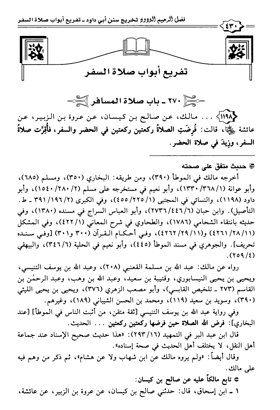 ١١٩٨ - . . . مالك، عن صالح بن كيسان، عن عروة بن الزبير، عن عائشة -رضي اللَّه عنها-، قالت: فُرِضَتِ الصلاةُ ركعتين ركعتين في الحضر والسفر، فأُقِرَّت صلاةُ السفر، وزِيدَ في صلاة الحضر.